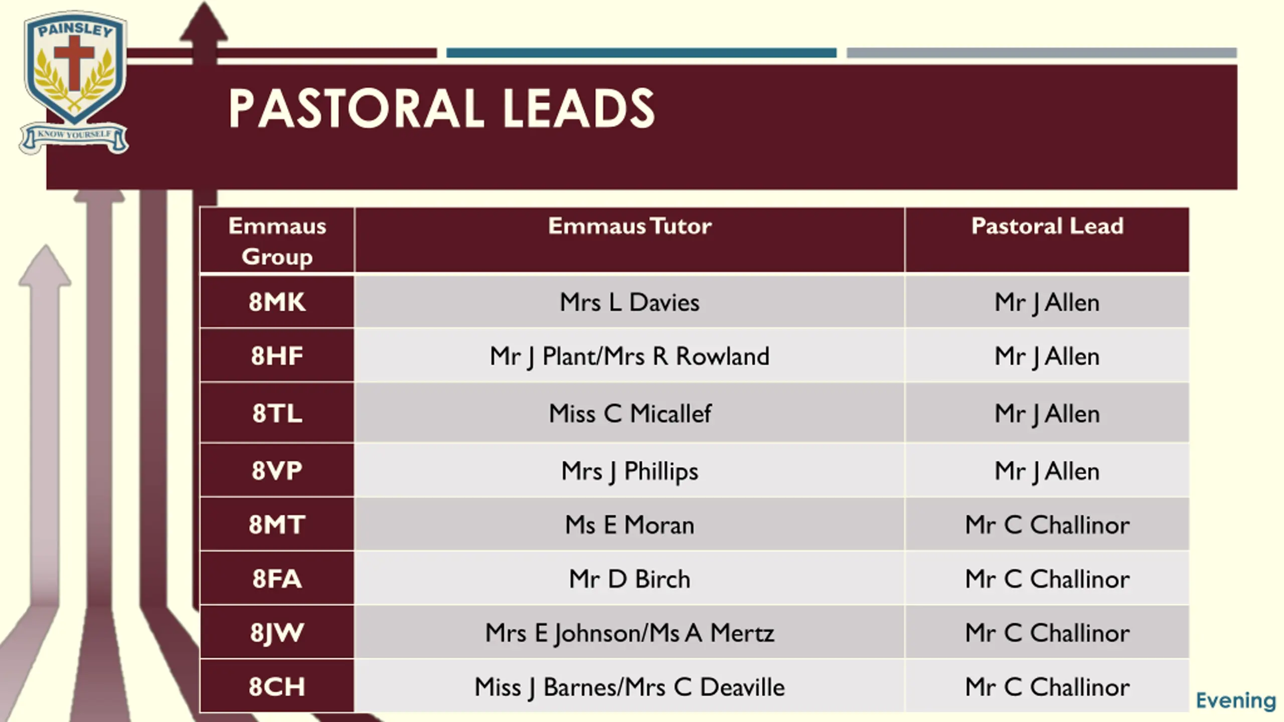 PASTORAL LEADS Emmaus Group Emmaus Tutor Pastoral Lead Mrs L Davies Mr J Allen 8MK Mr J Plant/Mrs R Rowland 8HF Mr J Allen Mr J Allen Miss C Micallef 8TL Mrs J Phillips 8VP Mr J Allen Ms E Moran Mr C Challinor 8MT Mr C Challinor 8FA Mr D Birch Mrs E Johnson/Ms A Mertz Mr C Challinor 8JW Miss J Barnes/Mrs C Deaville 8CH Mr C Challinor Year 8 Curriculum Evening