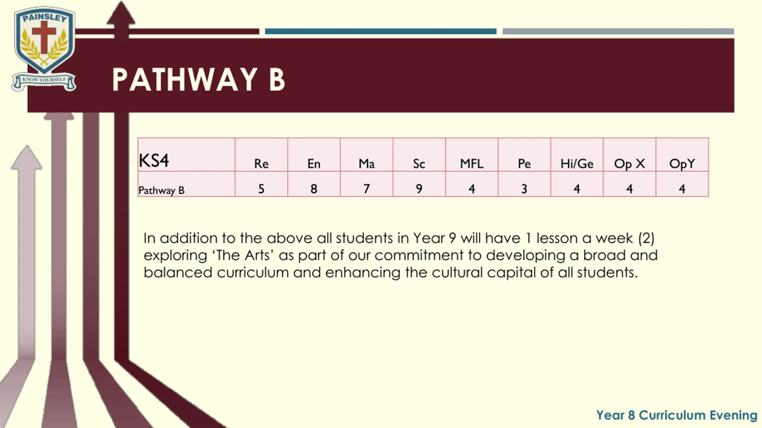 PATHWAY B KS4 Re En Ma Sc MFL Pe Hi/Ge Op X OpY 5 8 7 9 4 3 4 4 4 Pathway B In addition to the above all students in Year 9 will have 1 lesson a week (2) exploring The Arts as part of our commitment to developing a broad and balanced curriculum and enhancing the cultural capital of all students. Year 8 Curriculum Evening