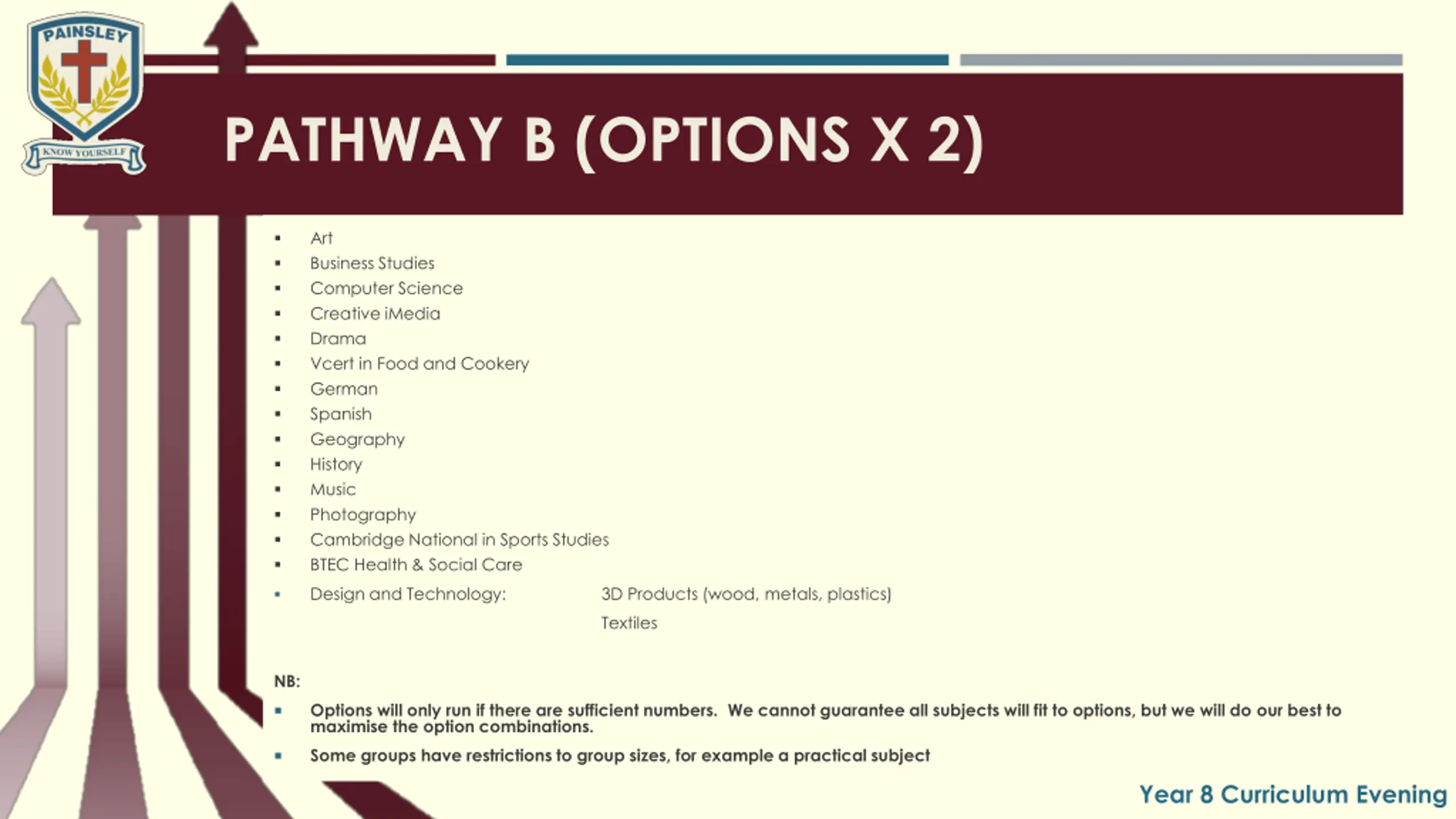 PATHWAY B (OPTIONS X 2) Art Business Studies Computer Science Creative iMedia Drama Vcert in Food and Cookery German Spanish Geography History Music Photography Cambridge National in Sports Studies BTEC Health & Social Care Design and Technology: 3D Products (wood, metals, plastics) Textiles NB: Options will only run if there are sufficient numbers. We cannot guarantee all subjects will fit to options, but we will do our best to maximise the option combinations. Some groups have restrictions to group sizes, for example a practical subject Year 8 Curriculum Evening