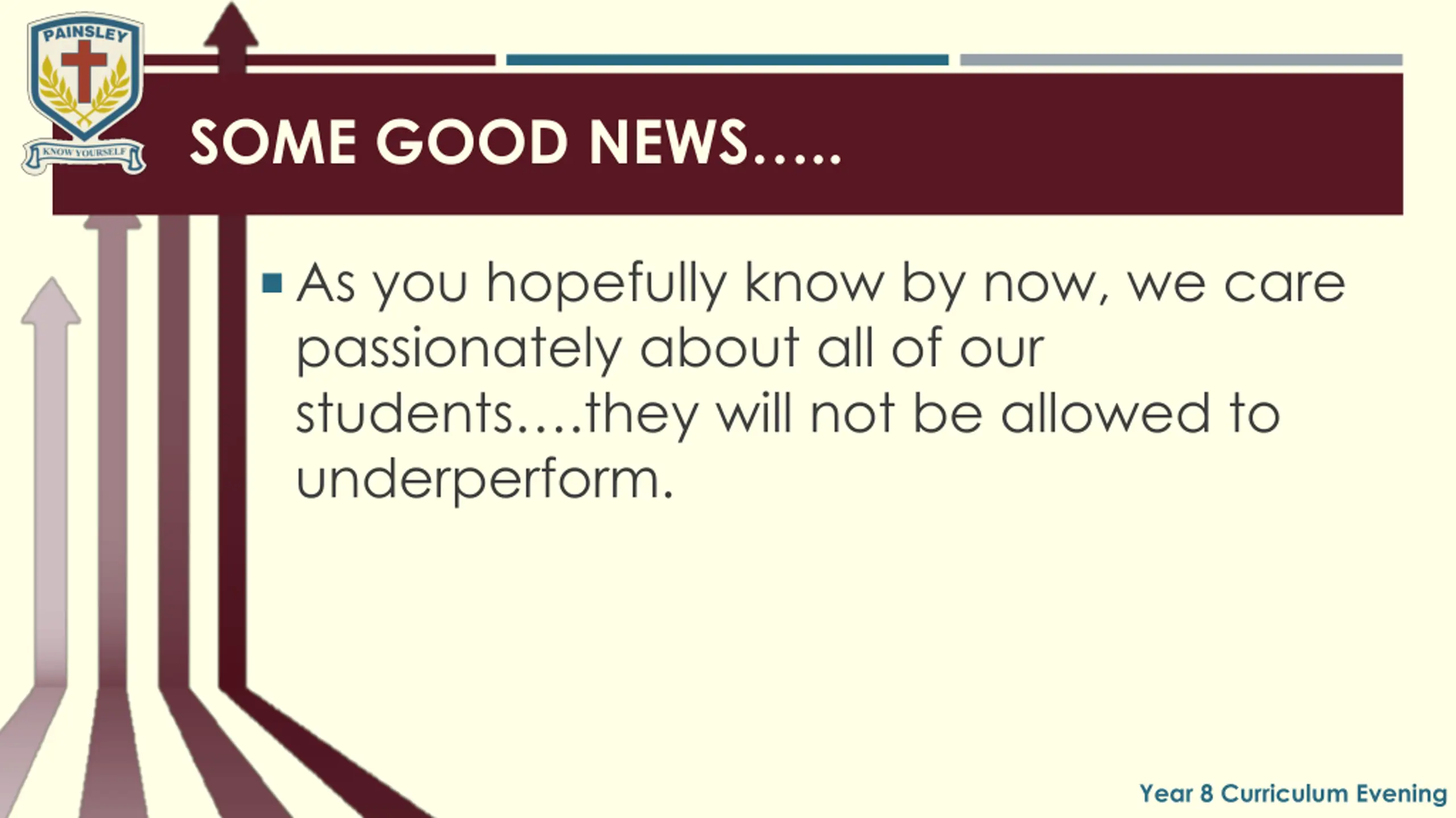 SOME GOOD NEWS.. As you hopefully know by now, we care passionately about all of our students .they will not be allowed to underperform. Year 8 Curriculum Evening