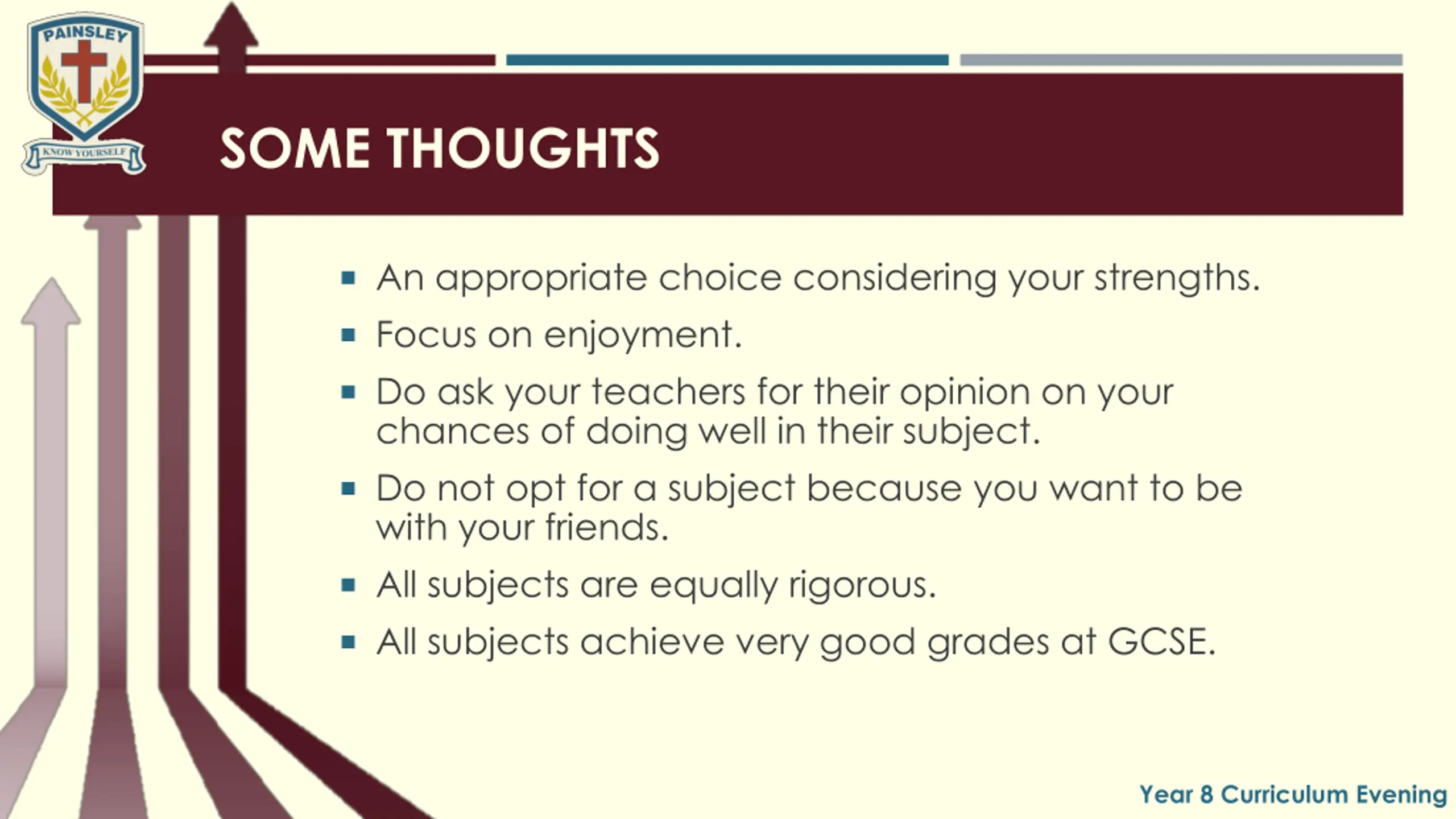 SOME THOUGHTS An appropriate choice considering your strengths. Focus on enjoyment. Do ask your teachers for their opinion on your chances of doing well in their subject. Do not opt for a subject because you want to be with your friends. All subjects are equally rigorous. All subjects achieve very good grades at GCSE. Year 8 Curriculum Evening