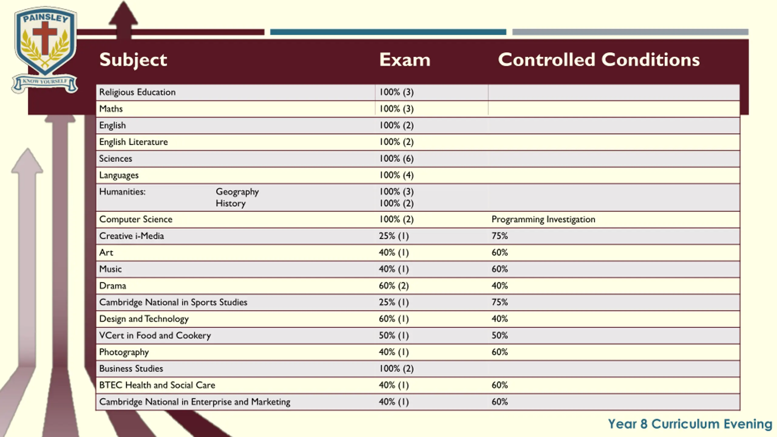 Subject Exam Controlled Conditions Religious Education 100% (3) Maths 100% (3) English 100% (2) English Literature 100% (2) Sciences 100% (6) Languages 100% (4) Humanities: Computer Science Geography History 100% (3) 100% (2) 100% (2) Programming Investigation Creative i-Media 25% (1) 75% Art 40% (1) 60% Music 40% (1) 60% Drama 60% (2) 40% Cambridge National in Sports Studies 25% (1) 75% Design and Technology 60% (1) 40% VCert in Food and Cookery 50% (1) 50% Photography 40% (1) 60% Business Studies 100% (2) BTEC Health and Social Care 40% (1) 60% Cambridge National in Enterprise and Marketing 40% (1) 60% Year 8 Curriculum Evening