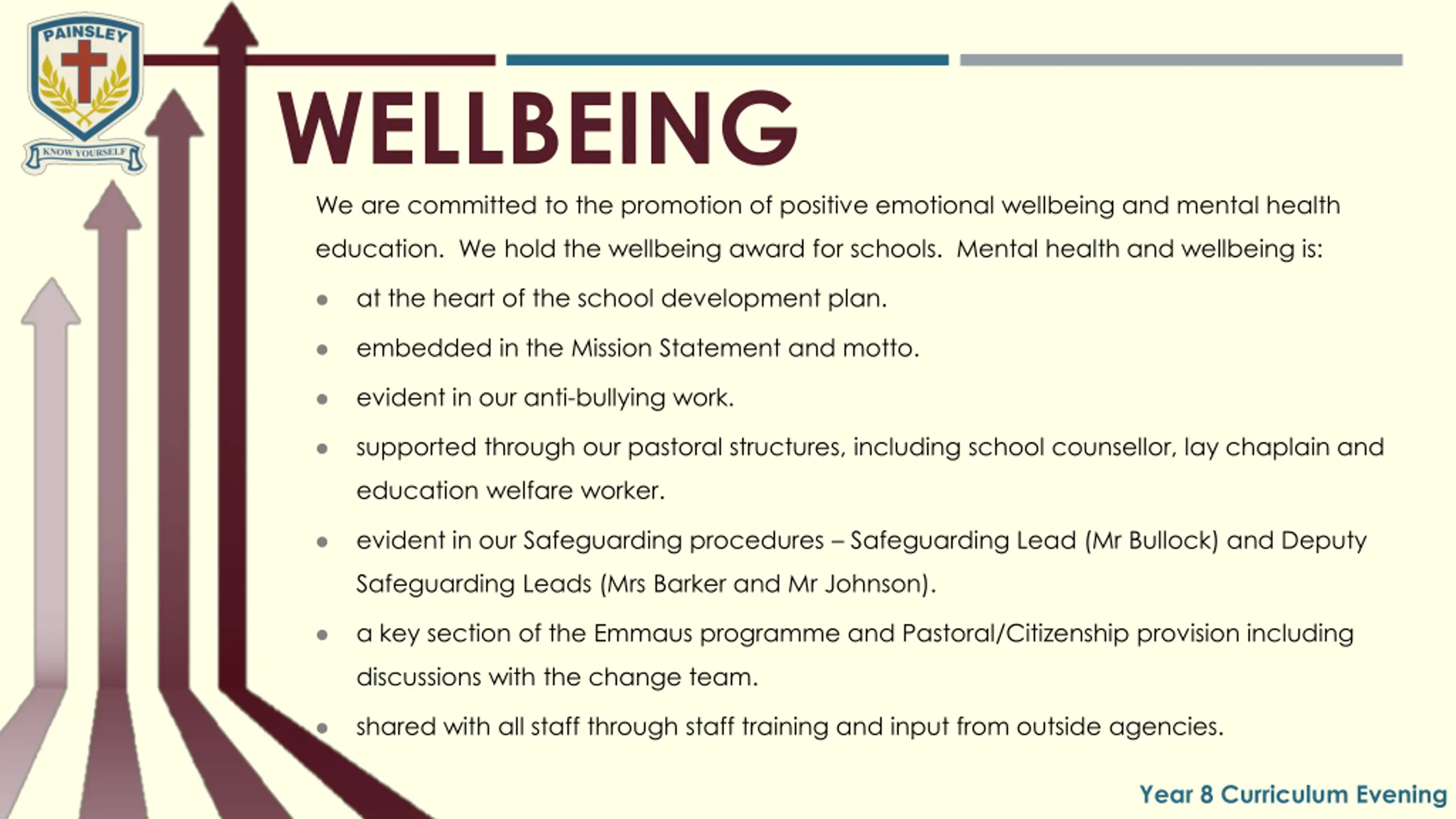 WELLBEING We are committed to the promotion of positive emotional wellbeing and mental health education. We hold the wellbeing award for schools. Mental health and wellbeing is: at the heart of the school development plan. embedded in the Mission Statement and motto. evident in our anti-bullying work. supported through our pastoral structures, including school counsellor, lay chaplain and education welfare worker. evident in our Safeguarding procedures Safeguarding Lead (Mr Bullock) and Deputy Safeguarding Leads (Mrs Barker and Mr Johnson). a key section of the Emmaus programme and Pastoral/Citizenship provision including discussions with the change team. shared with all staff through staff training and input from outside agencies. Year 8 Curriculum Evening