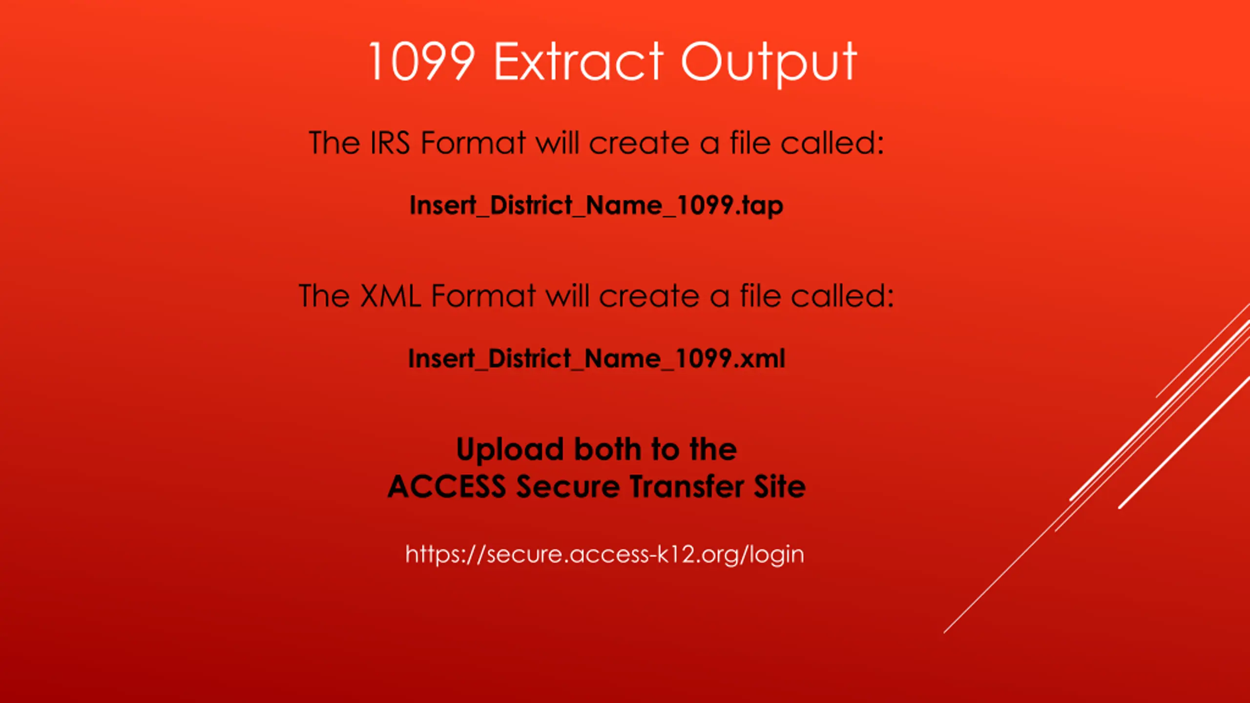 - 1099 Extract Output The IRS Format will create a file called: Insert_District_Name_1099.tap The XML Format will create a file called: Insert_District_Name_1099.xml Upload both to the ACCESS Secure Transfer Site https://secure.access-k12.org/login