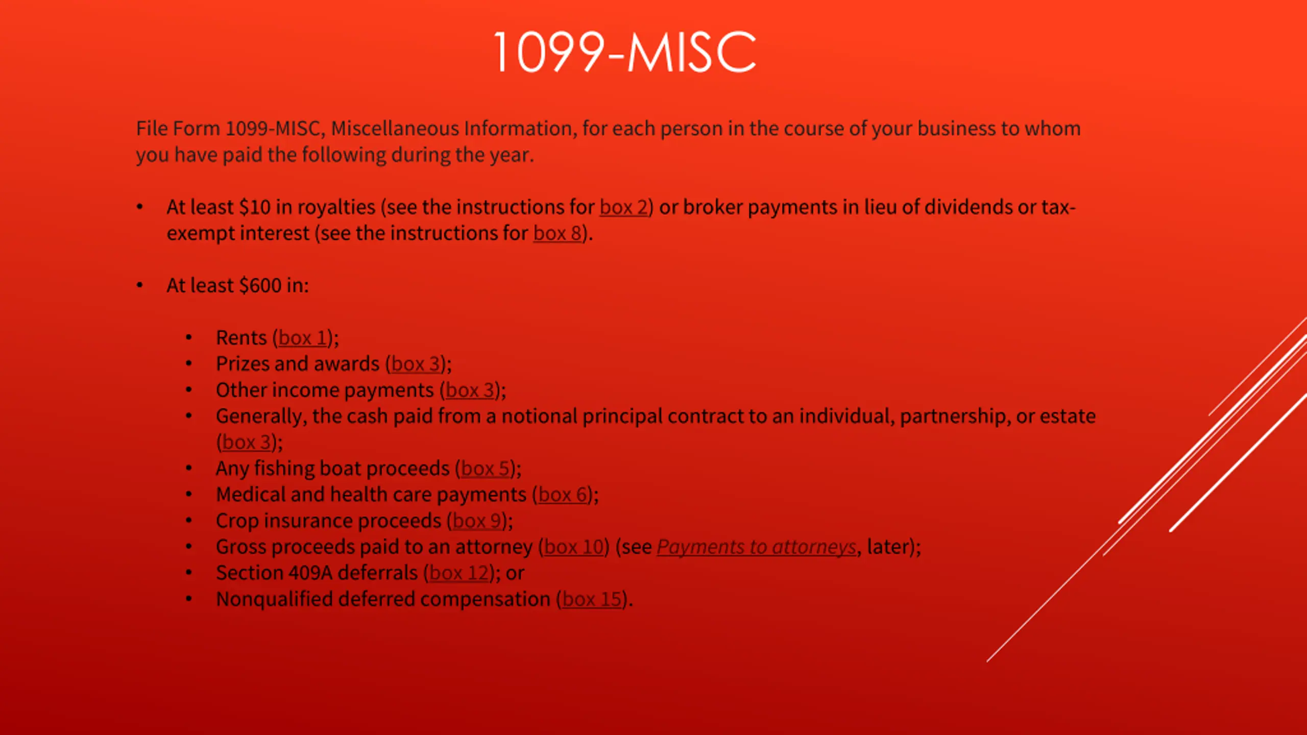 - 1099-MISC File Form 1099-MISC, Miscellaneous Information, for each person in the course of your business to whom you have paid the following during the year. At least $10 in royalties (see the instructions for box 2) or broker payments in lieu of dividends or tax- exempt interest (see the instructions for box 8). At least $600 in: Rents (box 1); Prizes and awards (box 3); Other income payments (box 3); Generally, the cash paid from a notional principal contract to an individual, partnership, or estate (box 3); Any fishing boat proceeds (box 5); Medical and health care payments (box 6); Crop insurance proceeds (box 9); Gross proceeds paid to an attorney (box 10) (see Payments to attorneys, later); Section 409A deferrals (box 12); or Nonqualified deferred compensation (box 15).