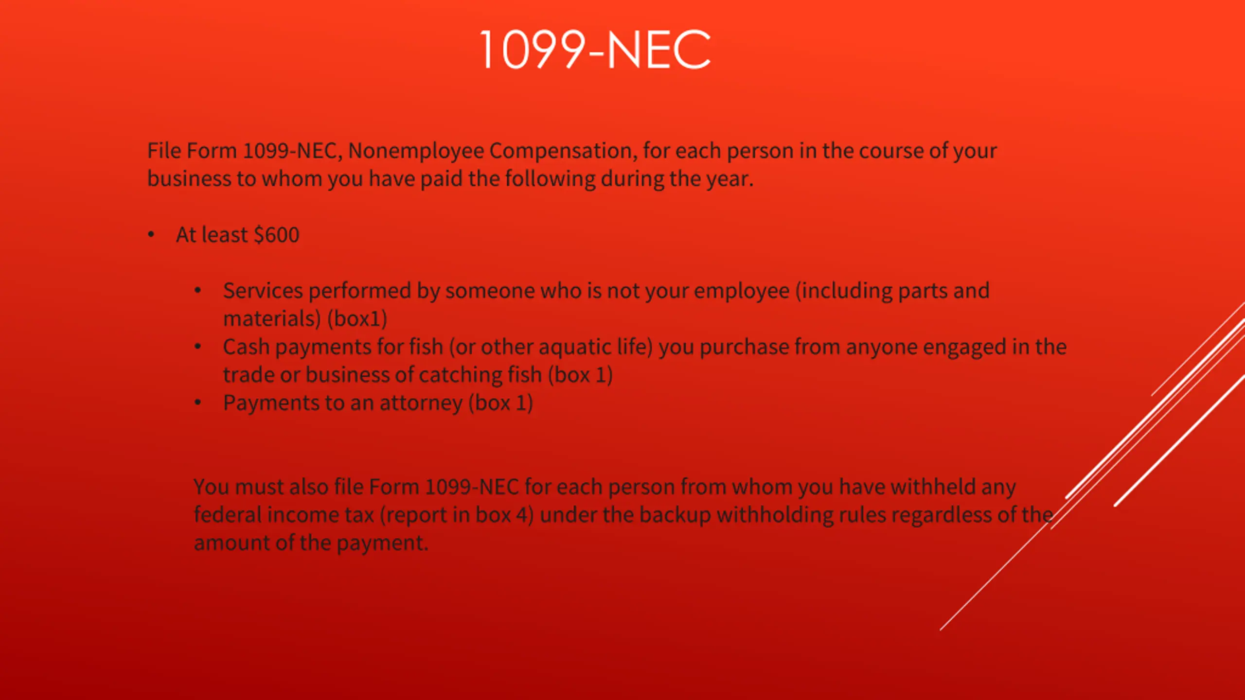 - 1099-NEC File Form 1099-NEC, Nonemployee Compensation, for each person in the course of your business to whom you have paid the following during the year. At least $600 Services performed by someone who is not your employee (including parts and materials) (box1) Cash payments for fish (or other aquatic life) you purchase from anyone engaged in the trade or business of catching fish (box 1) Payments to an attorney (box 1) You must also file Form 1099-NEC for each person from whom you have withheld any federal income tax (report in box 4) under the backup withholding rules regardless of the amount of the payment.