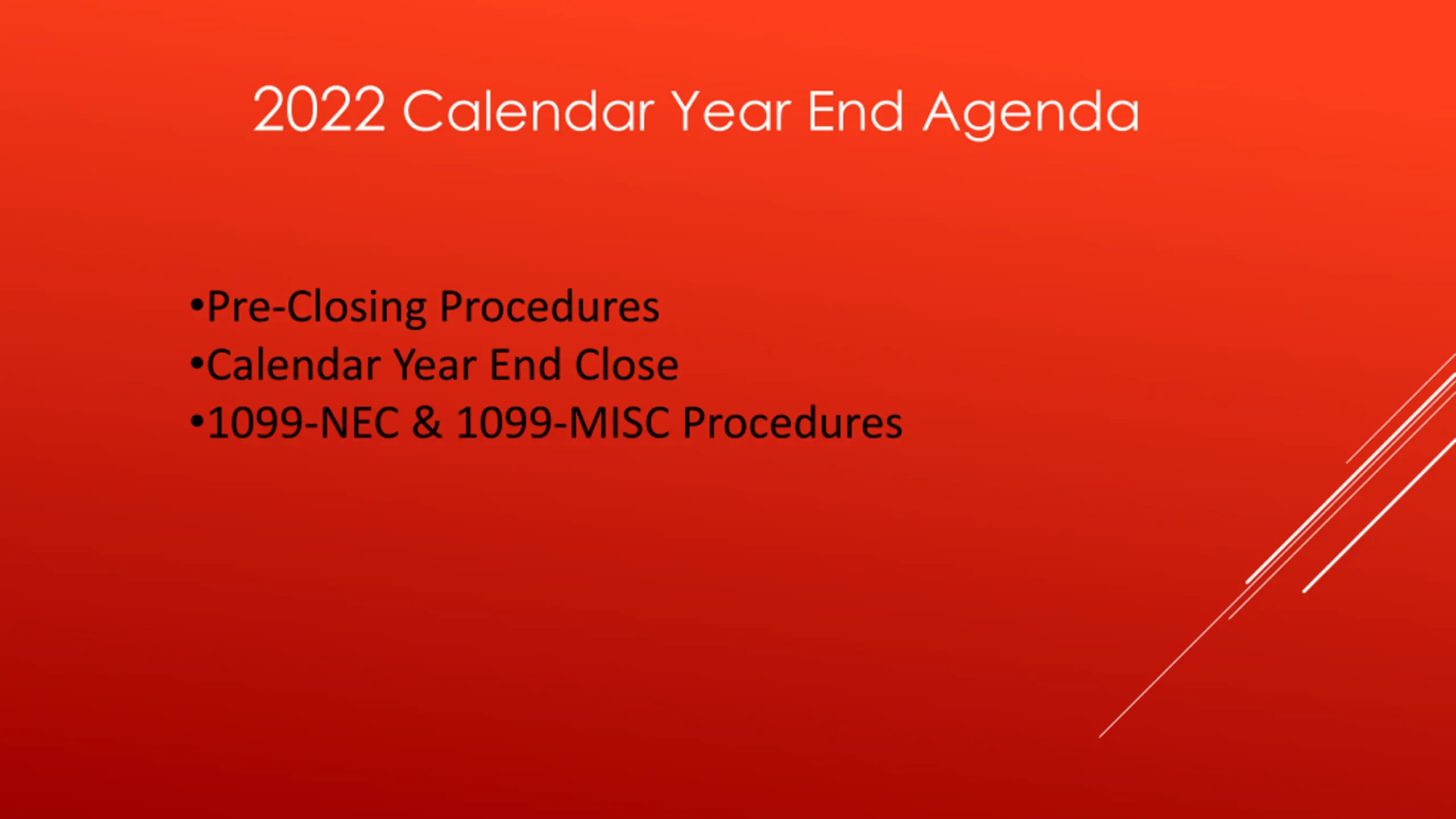- 2022 Calendar Year End Agenda Pre-Closing Procedures Calendar Year End Close 1099-NEC & 1099-MISC Procedures
