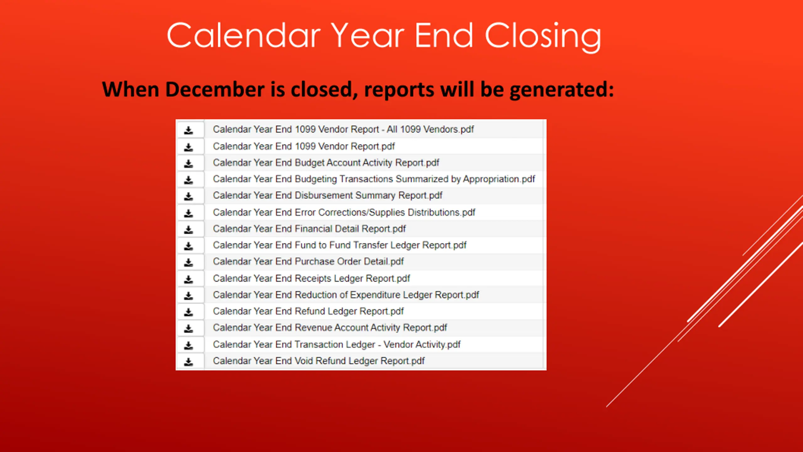 - Calendar Year End Closing When December is closed, reports will be generated: