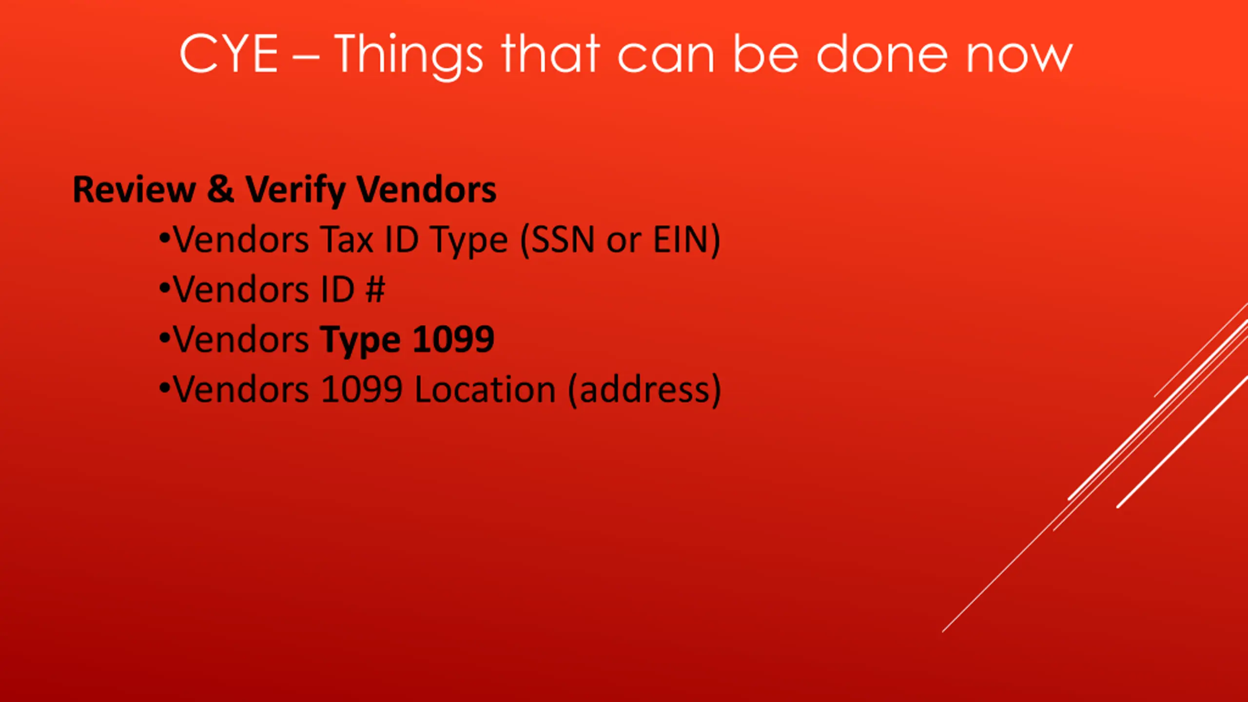 - CYE-Things That Can Be Done Now Review & Verify: Vendors 1099 Location (address) Vendors Tax ID Type (SSN or EIN) Vendors ID # Vendors Type 1099