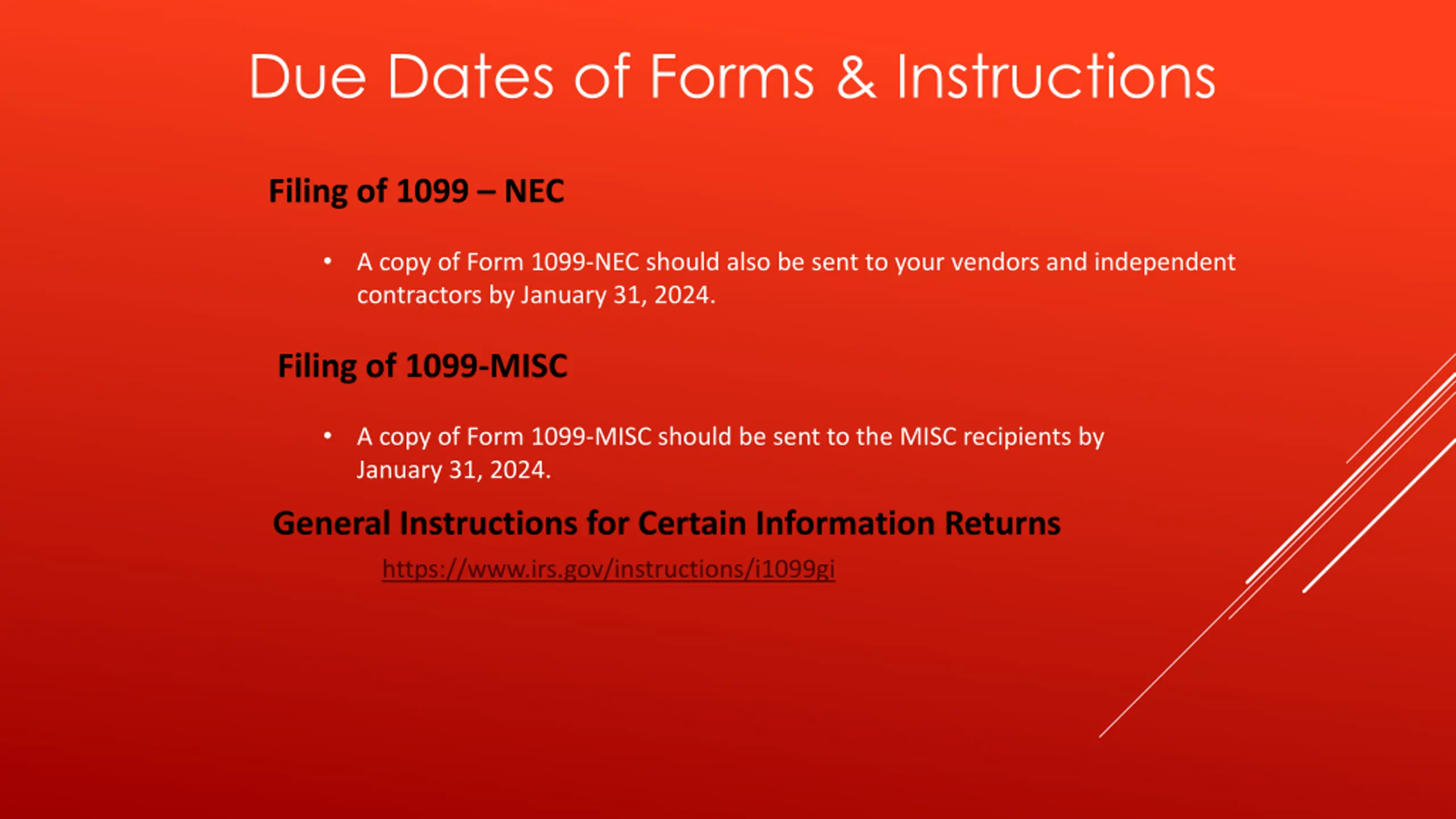 - Due Dates of Forms & Instructions Filing of 1099 NEC A copy of Form 1099-NEC should also be sent to your vendors and independent contractors by January 31, 2024. Filing of 1099-MISC A copy of Form 1099-MISC should be sent to the MISC recipients by January 31, 2024. General Instructions for Certain Information Returns https://www.irs.gov/instructions/i1099gi