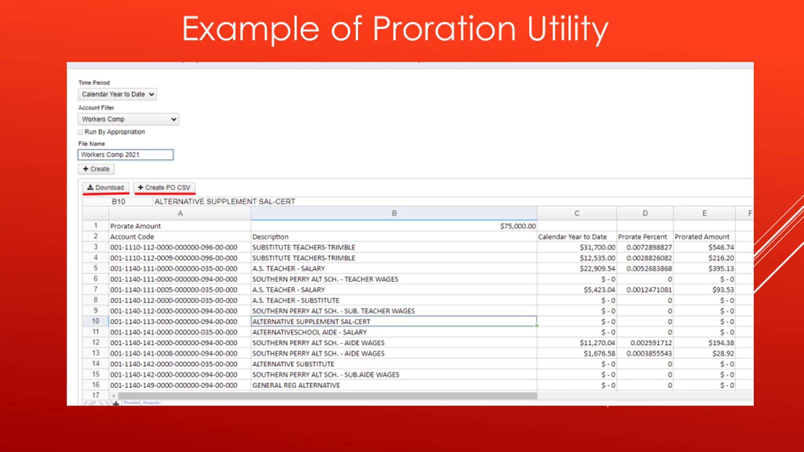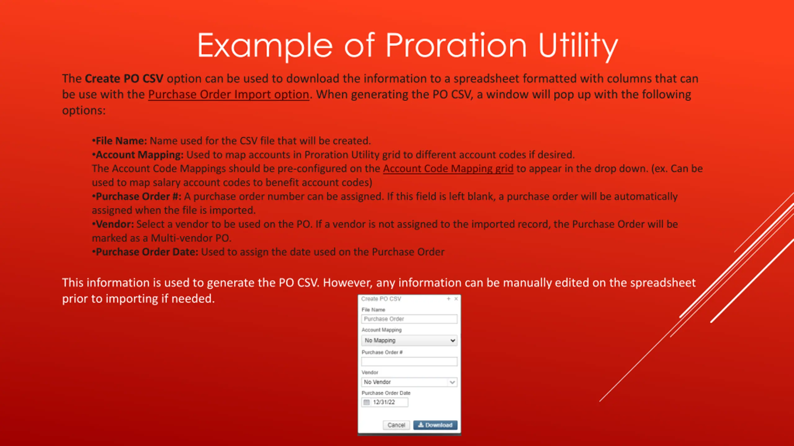 - Example of Proration Utility The Create PO CSV option can be used to download the information to a spreadsheet formatted with columns that can be use with the Purchase Order Import option. When generating the PO CSV, a window will pop up with the following options: File Name: Name used for the CSV file that will be created. Account Mapping: Used to map accounts in Proration Utility grid to different account codes if desired. The Account Code Mappings should be pre-configured on the Account Code Mapping grid to appear in the drop down. (ex. Can be used to map salary account codes to benefit account codes) Purchase Order #: A purchase order number can be assigned. If this field is left blank, a purchase order will be automatically assigned when the file is imported. Vendor: Select a vendor to be used on the PO. If a vendor is not assigned to the imported record, the Purchase Order will be marked as a Multi-vendor PO. Purchase Order Date: Used to assign the date used on the Purchase Order This information is used to generate the PO CSV. However, any information can be manually edited on the spreadsheet prior to importing if needed.