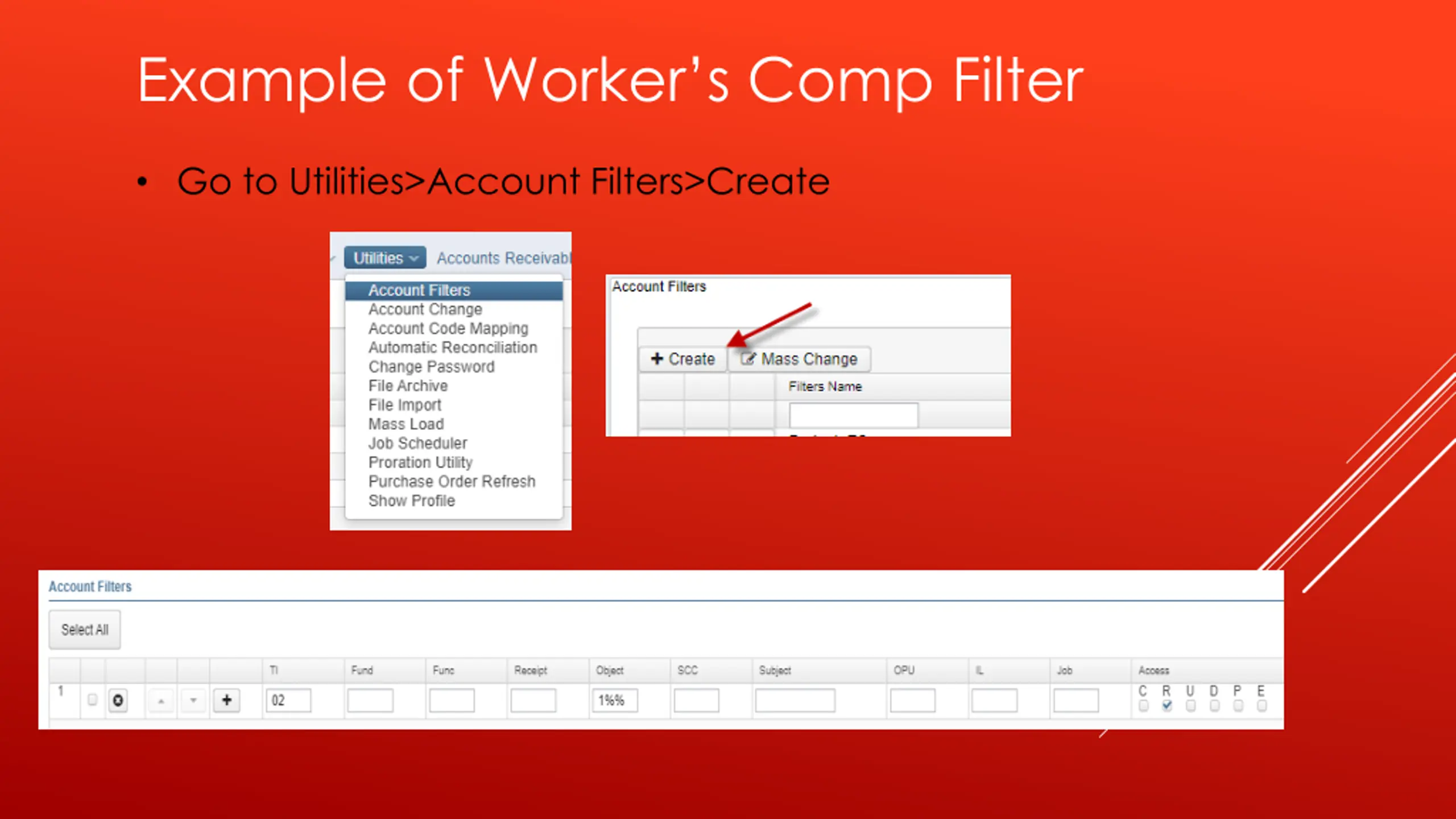 - Example of Workers Comp Filter Go to Utilities>Account Filters>Create
