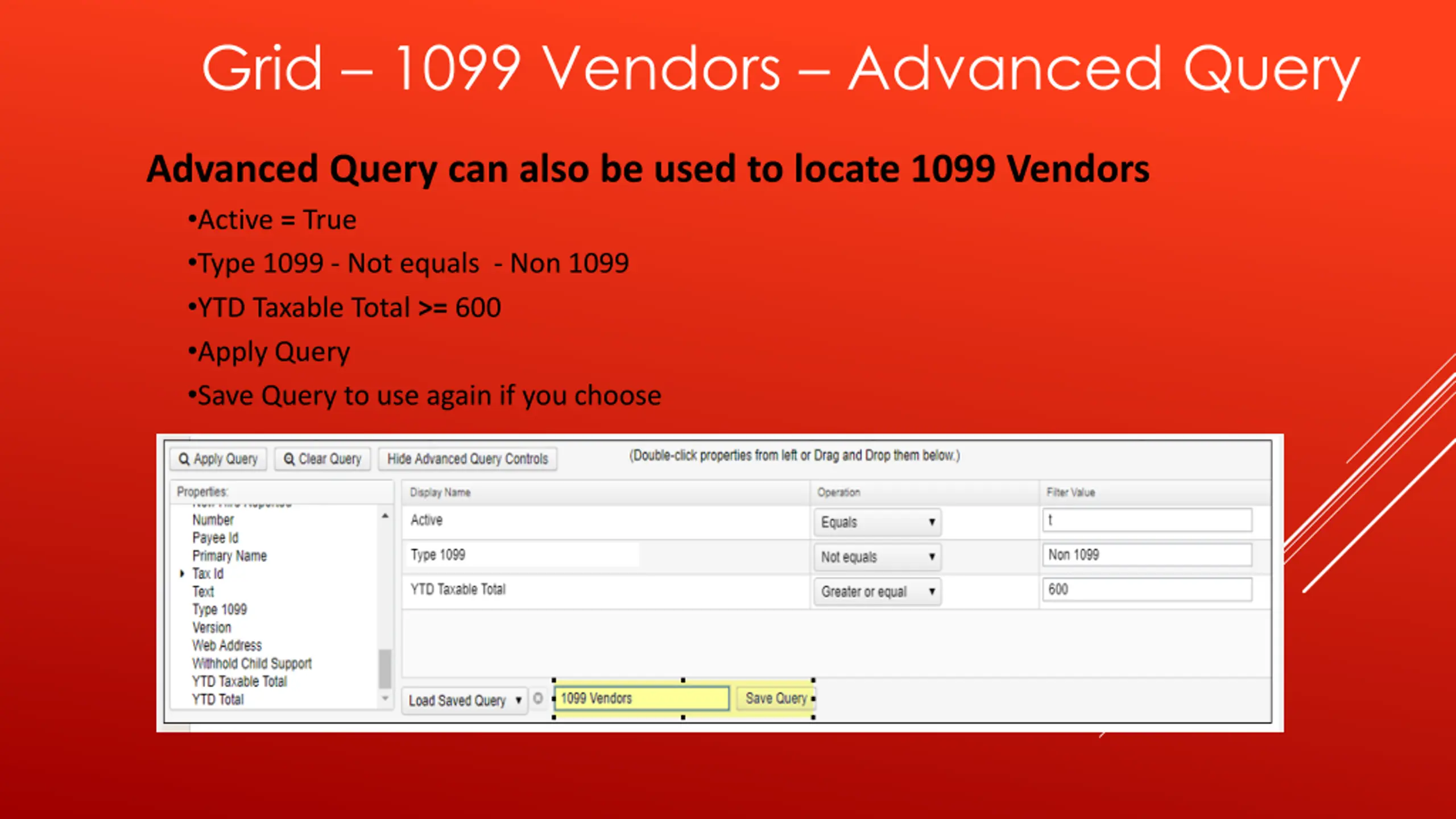- Grid 1099 Vendors Advanced Query Advanced Query can also be used to locate 1099 Vendors Active = True Type 1099 - Not equals - Non 1099 YTD Taxable Total >= 600 Apply Query Save Query to use again if you choose