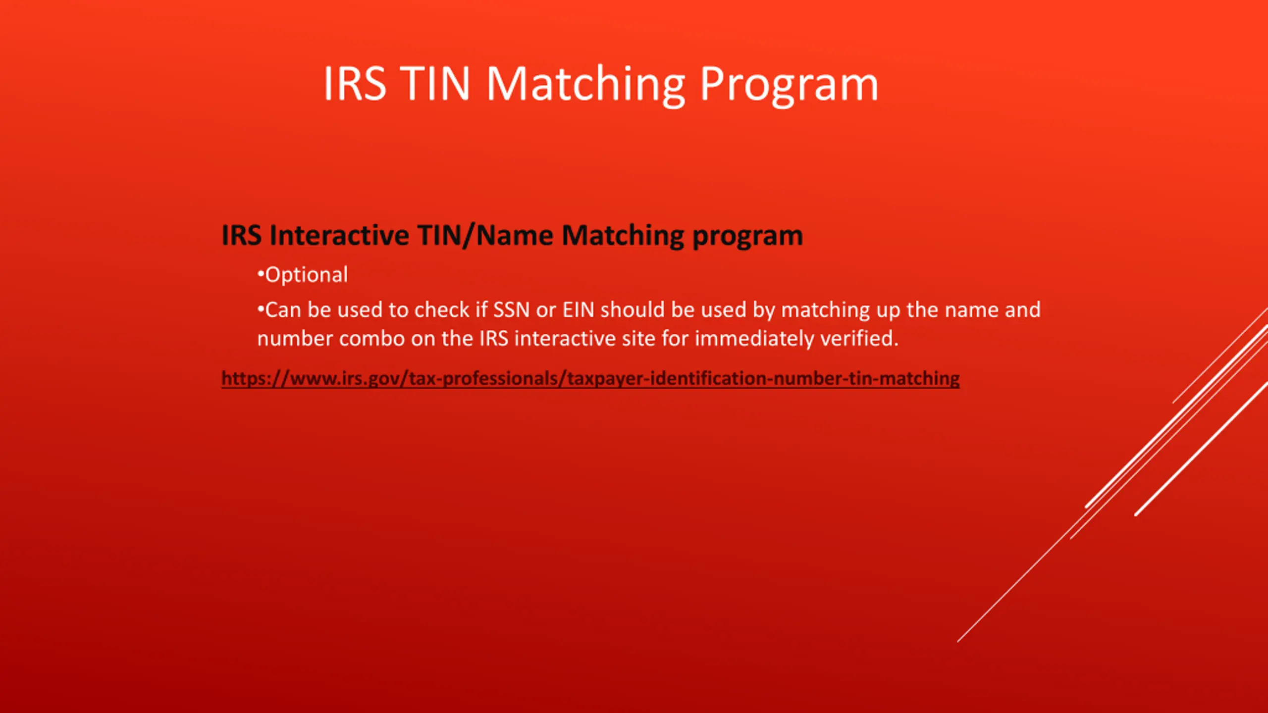 - IRS TIN Matching Program IRS Interactive TIN/Name Matching program Optional Can be used to check if SSN or EIN should be used by matching up the name and number combo on the IRS interactive site for immediately verified. https://www.irs.gov/tax-professionals/taxpayer-identification-number-tin-matching