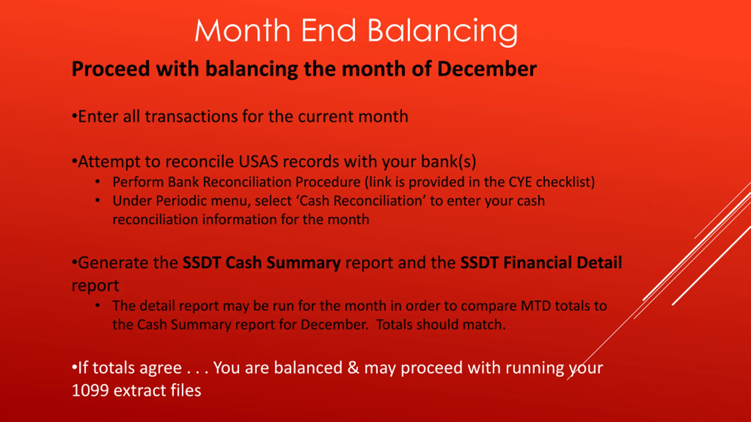 - Month End Balancing Proceed with balancing the month of December Enter all transactions for the current month Attempt to reconcile USAS records with your bank(s) Perform Bank Reconciliation Procedure (link is provided in the CYE checklist) Under Periodic menu, select Cash Reconciliation to enter your cash reconciliation information for the month Generate the SSDT Cash Summary report and the SSDT Financial Detail report The detail report may be run for the month in order to compare MTD totals to the Cash Summary report for December. Totals should match. If totals agree . . . You are balanced & may proceed with running your 1099 extract files