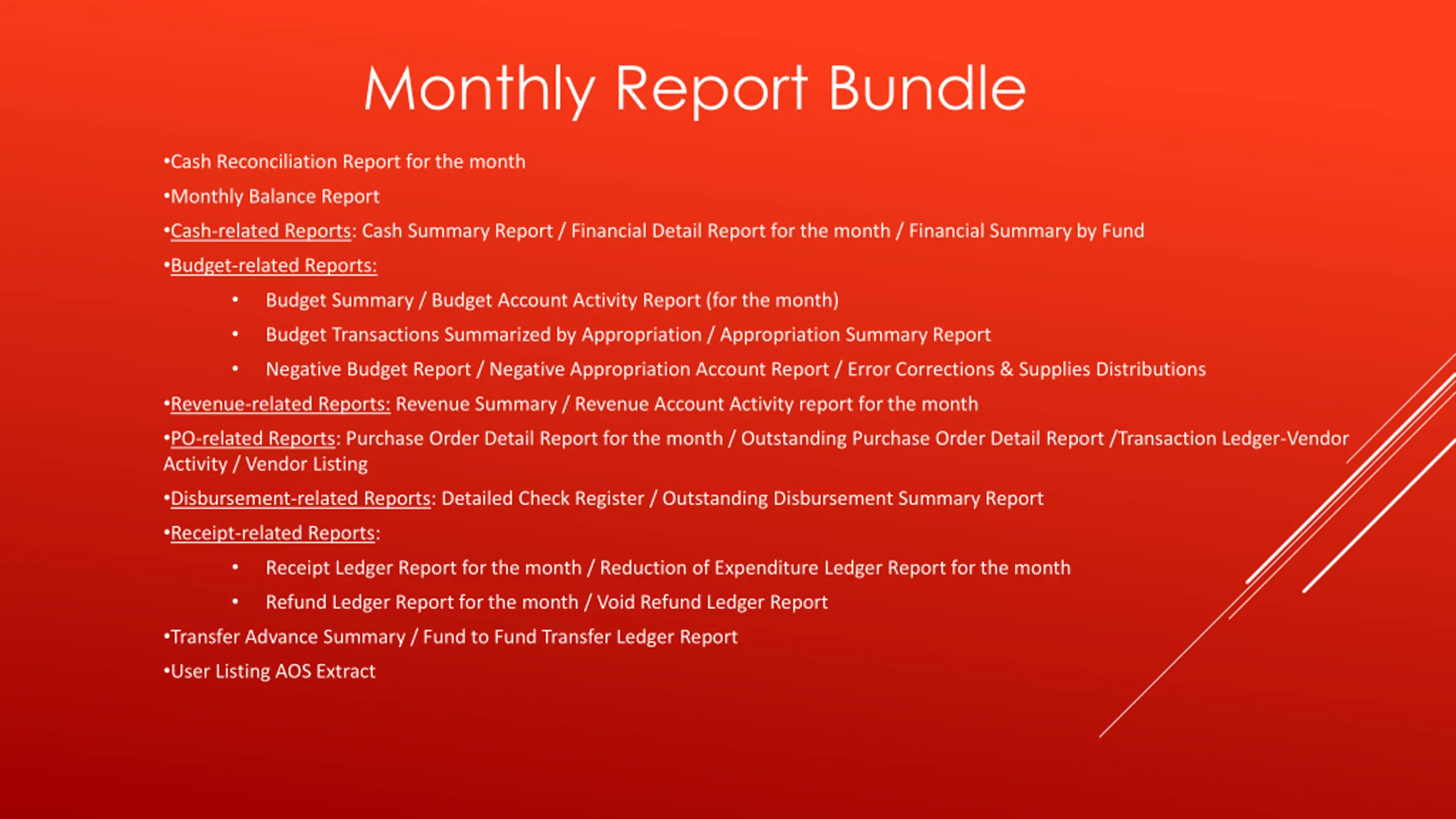- Monthly Report Bundle Cash Reconciliation Report for the month Monthly Balance Report Cash-related Reports: Cash Summary Report / Financial Detail Report for the month / Financial Summary by Fund Budget-related Reports: Budget Summary / Budget Account Activity Report (for the month) Budget Transactions Summarized by Appropriation / Appropriation Summary Report Negative Budget Report / Negative Appropriation Account Report / Error Corrections & Supplies Distributions Revenue-related Reports: Revenue Summary / Revenue Account Activity report for the month PO-related Reports: Purchase Order Detail Report for the month / Outstanding Purchase Order Detail Report /Transaction Ledger-Vendor Activity / Vendor Listing Disbursement-related Reports: Detailed Check Register / Outstanding Disbursement Summary Report Receipt-related Reports: Receipt Ledger Report for the month / Reduction of Expenditure Ledger Report for the month Refund Ledger Report for the month / Void Refund Ledger Report Transfer Advance Summary / Fund to Fund Transfer Ledger Report User Listing AOS Extract