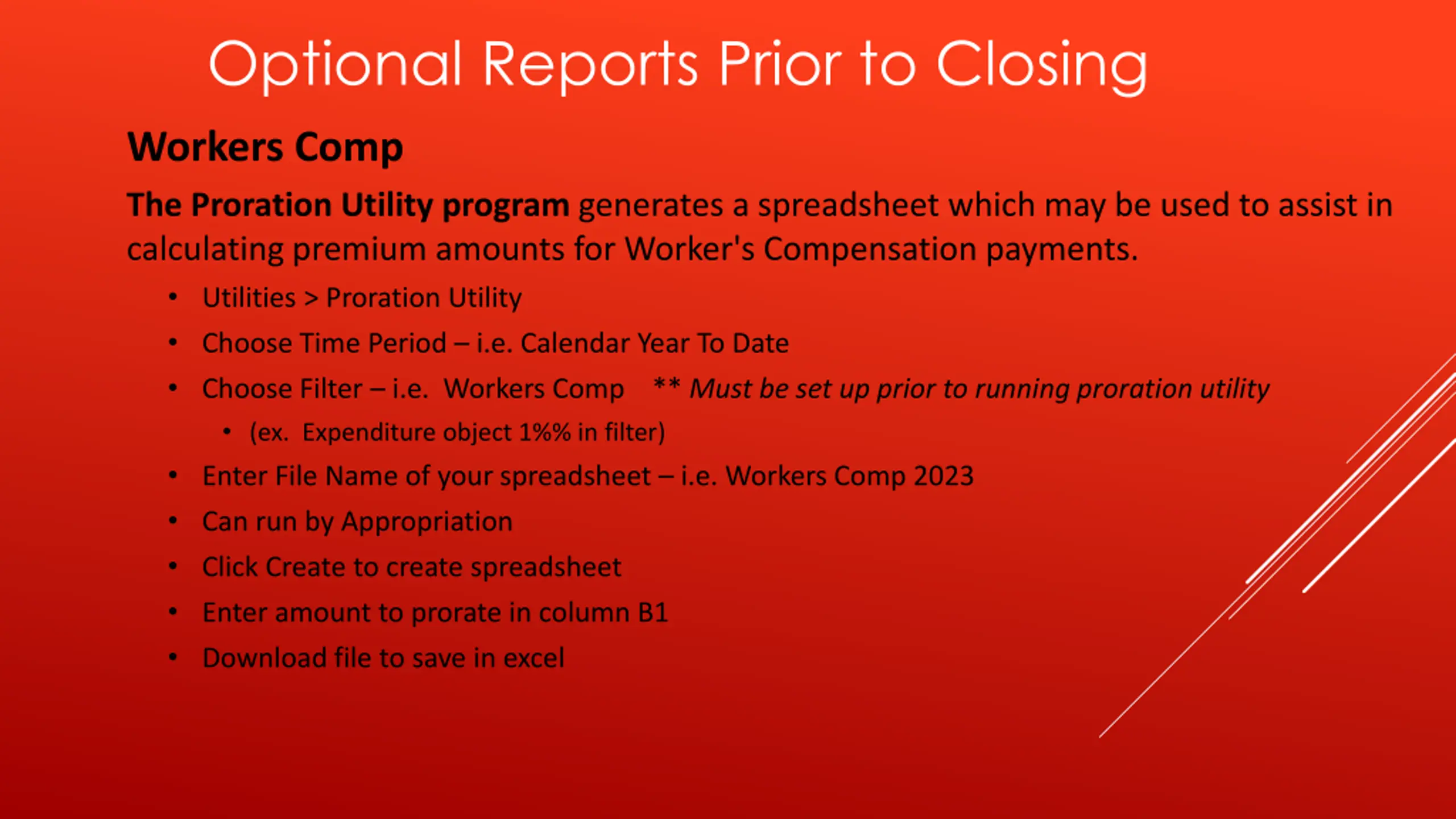 - Optional Reports Prior to Closing Workers Comp The Proration Utility program generates a spreadsheet which may be used to assist in calculating premium amounts for Worker's Compensation payments. Utilities > Proration Utility Choose Time Period i.e. Calendar Year To Date Choose Filter i.e. Workers Comp ** Must be set up prior to running proration utility (ex. Expenditure object 1%% in filter) Enter File Name of your spreadsheet i.e. Workers Comp 2023 Can run by Appropriation Click Create to create spreadsheet Enter amount to prorate in column B1 Download file to save in excel