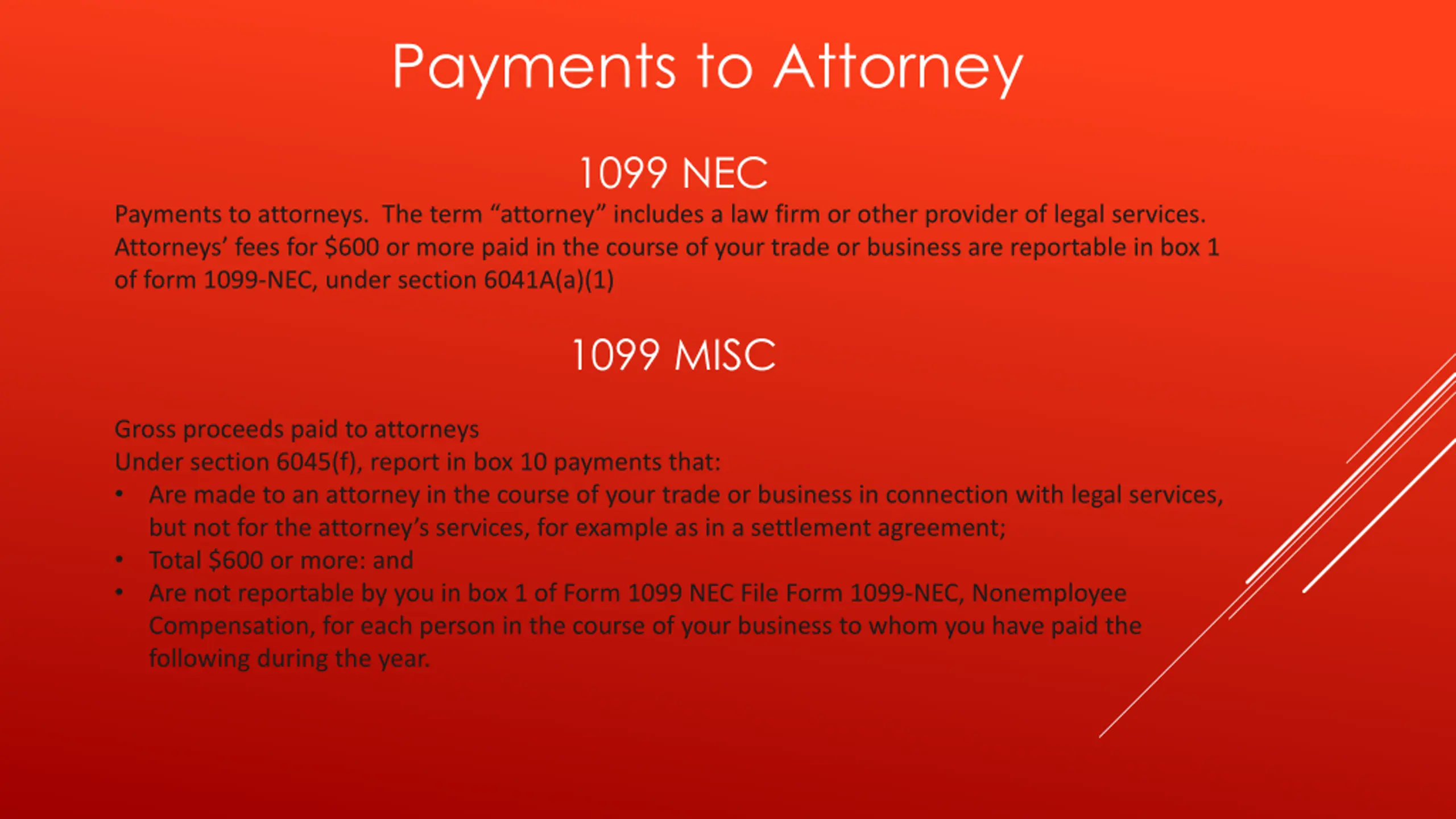 - Payments to Attorney 1099 NEC Payments to attorneys. The term attorney includes a law firm or other provider of legal services. Attorneys fees for $600 or more paid in the course of your trade or business are reportable in box 1 of form 1099-NEC, under section 6041A(a)(1) 1099 MISC Gross proceeds paid to attorneys Under section 6045(f), report in box 10 payments that: Are made to an attorney in the course of your trade or business in connection with legal services, but not for the attorney s services, for example as in a settlement agreement; Total $600 or more: and Are not reportable by you in box 1 of Form 1099 NEC File Form 1099-NEC, Nonemployee Compensation, for each person in the course of your business to whom you have paid the following during the year.