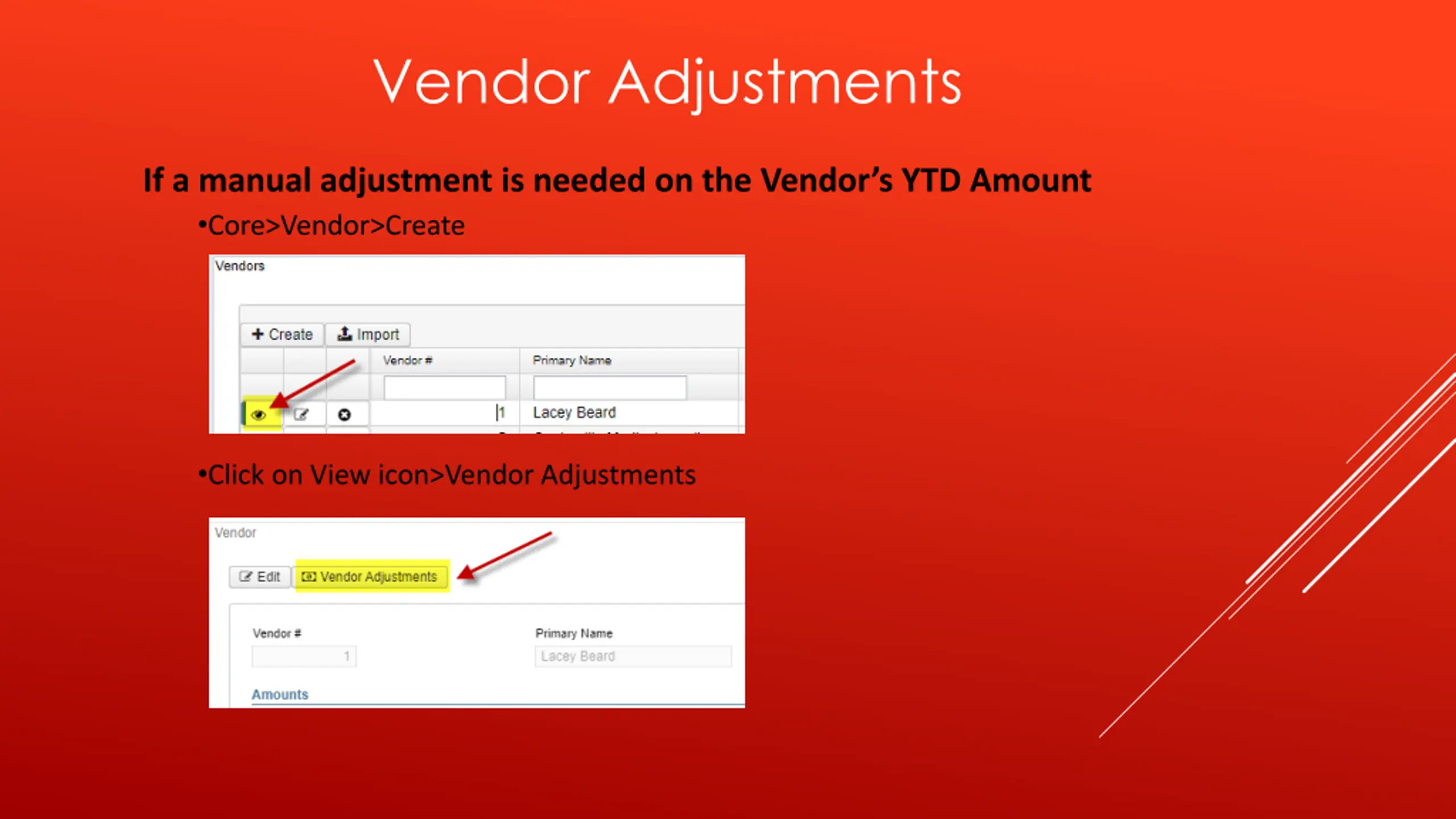- Vendor Adjustments If a manual adjustment is needed on the Vendor s YTD Amount Core>Vendor>Create Click on View icon>Vendor Adjustments