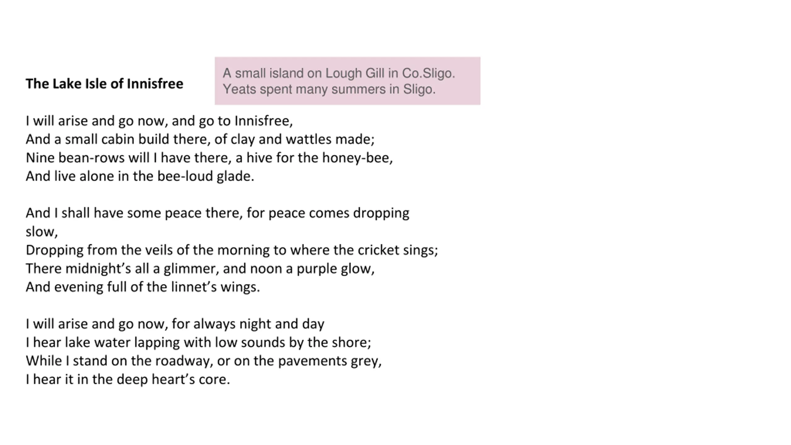 A small island on Lough Gill in Co.Sligo. Yeats spent many summers in Sligo. The Lake Isle of Innisfree I will arise and go now, and go to Innisfree, And a small cabin build there, of clay and wattles made; Nine bean-rows will I have there, a hive for the honey-bee, And live alone in the bee-loud glade. And I shall have some peace there, for peace comes dropping slow, Dropping from the veils of the morning to where the cricket sings; There midnight s all a glimmer, and noon a purple glow, And evening full of the linnet s wings. I will arise and go now, for always night and day I hear lake water lapping with low sounds by the shore; While I stand on the roadway, or on the pavements grey, I hear it in the deep heart s core.
