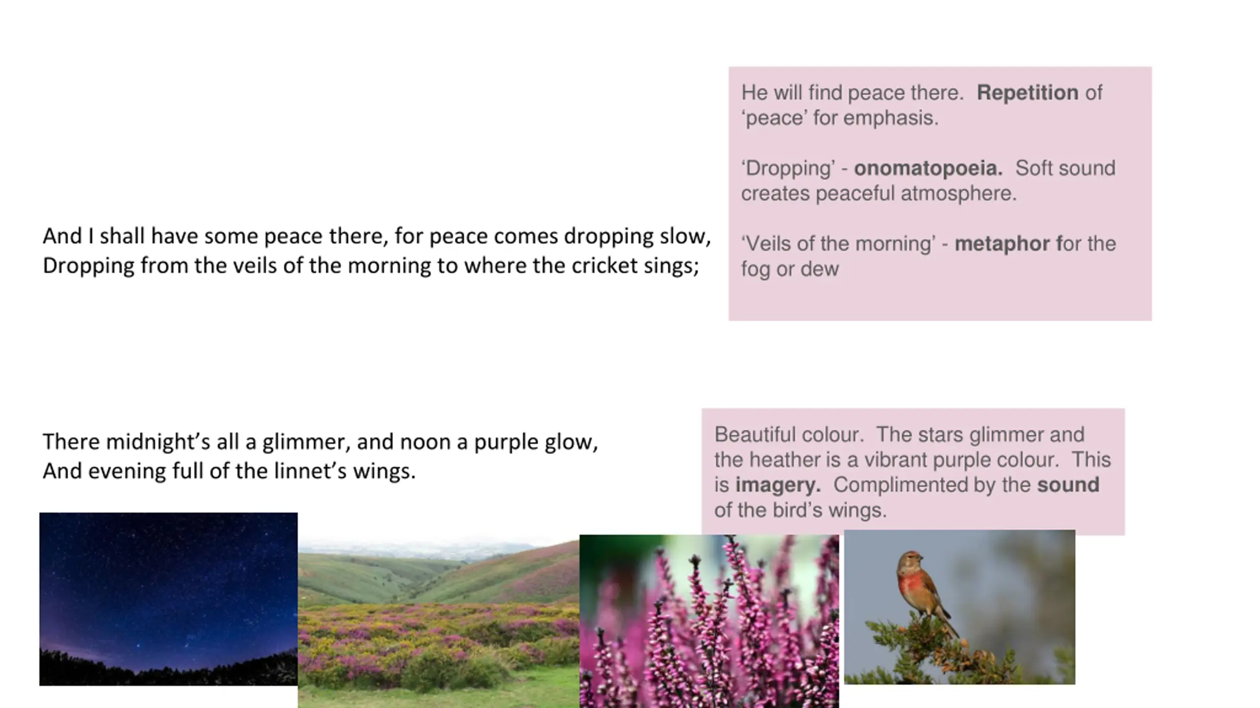 He will find peace there. Repetition of peace for emphasis. Dropping - onomatopoeia. Soft sound creates peaceful atmosphere. And I shall have some peace there, for peace comes dropping slow, Dropping from the veils of the morning to where the cricket sings; Veils of the morning - metaphor for the fog or dew Beautiful colour. The stars glimmer and the heather is a vibrant purple colour. This is imagery. Complimented by the sound of the bird s wings. There midnight s all a glimmer, and noon a purple glow, And evening full of the linnet s wings.