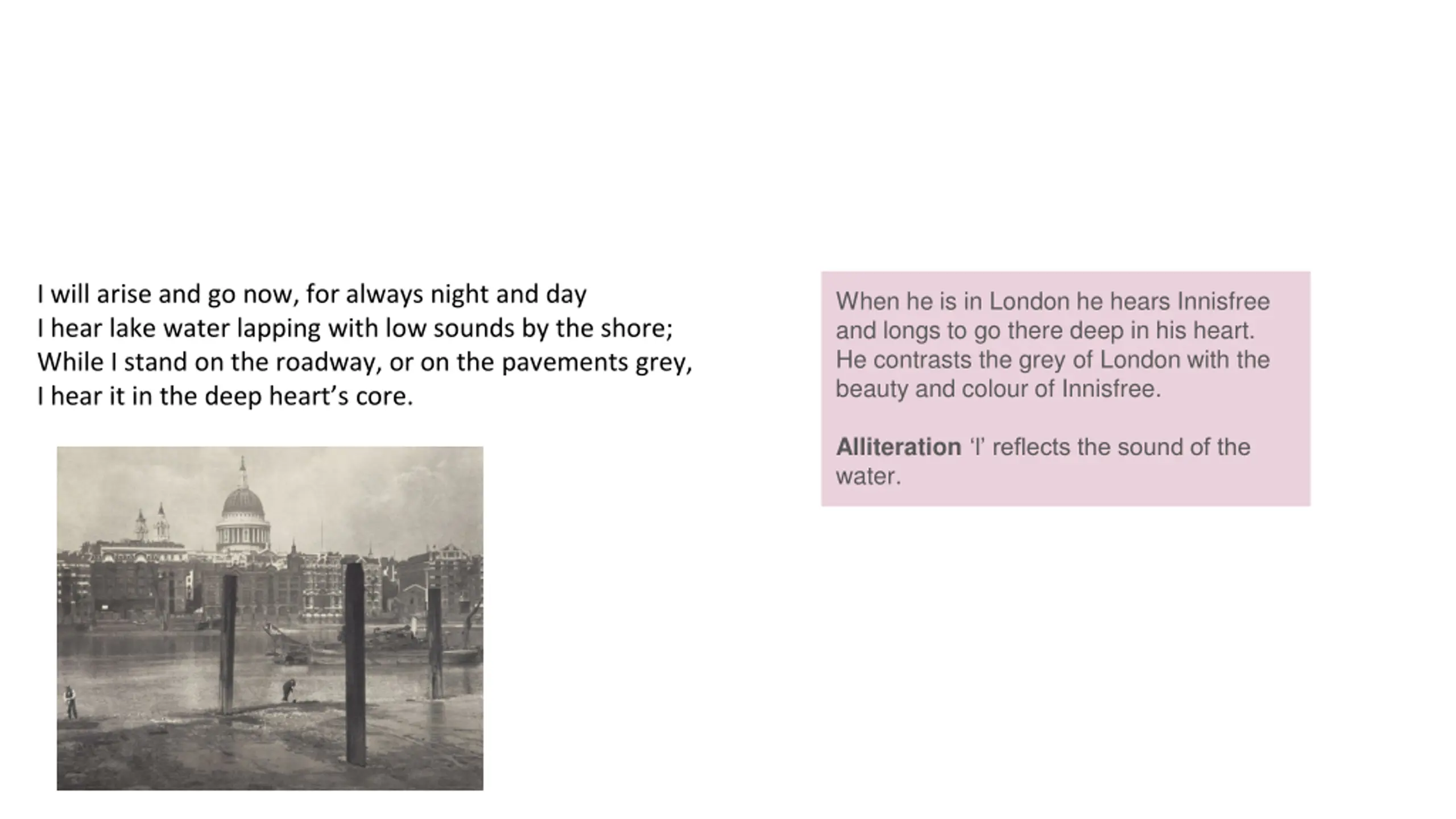 I will arise and go now, for always night and day I hear lake water lapping with low sounds by the shore; While I stand on the roadway, or on the pavements grey, I hear it in the deep heart s core. When he is in London he hears Innisfree and longs to go there deep in his heart. He contrasts the grey of London with the beauty and colour of Innisfree. Alliteration l reflects the sound of the water.