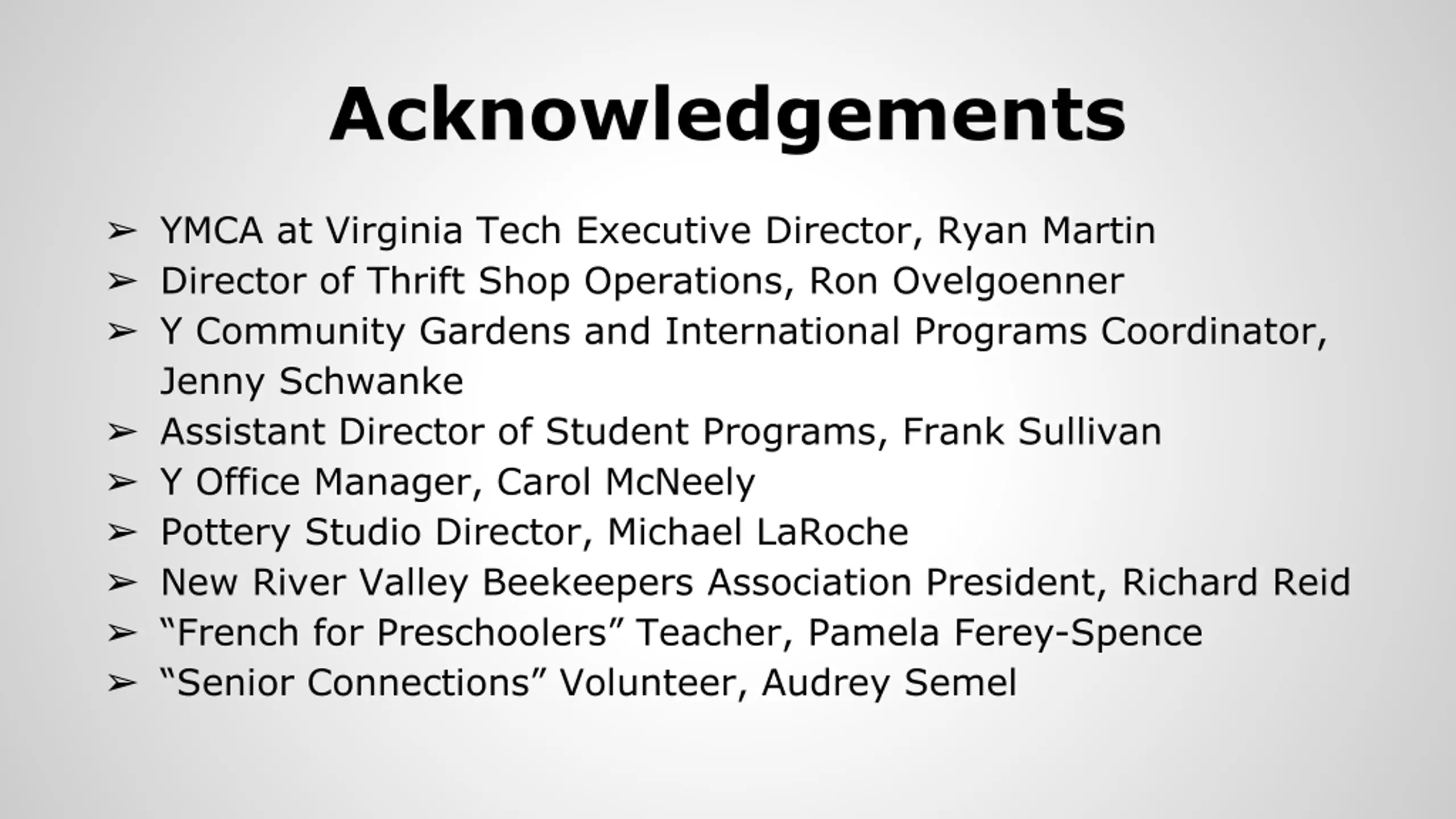 Acknowledgements YMCA at Virginia Tech Executive Director, Ryan Martin Director of Thrift Shop Operations, Ron Ovelgoenner Y Community Gardens and International Programs Coordinator, Jenny Schwanke Assistant Director of Student Programs, Frank Sullivan Y Office Manager, Carol McNeely Pottery Studio Director, Michael LaRoche New River Valley Beekeepers Association President, Richard Reid French for Preschoolers Teacher, Pamela Ferey-Spence Senior Connections Volunteer, Audrey Semel