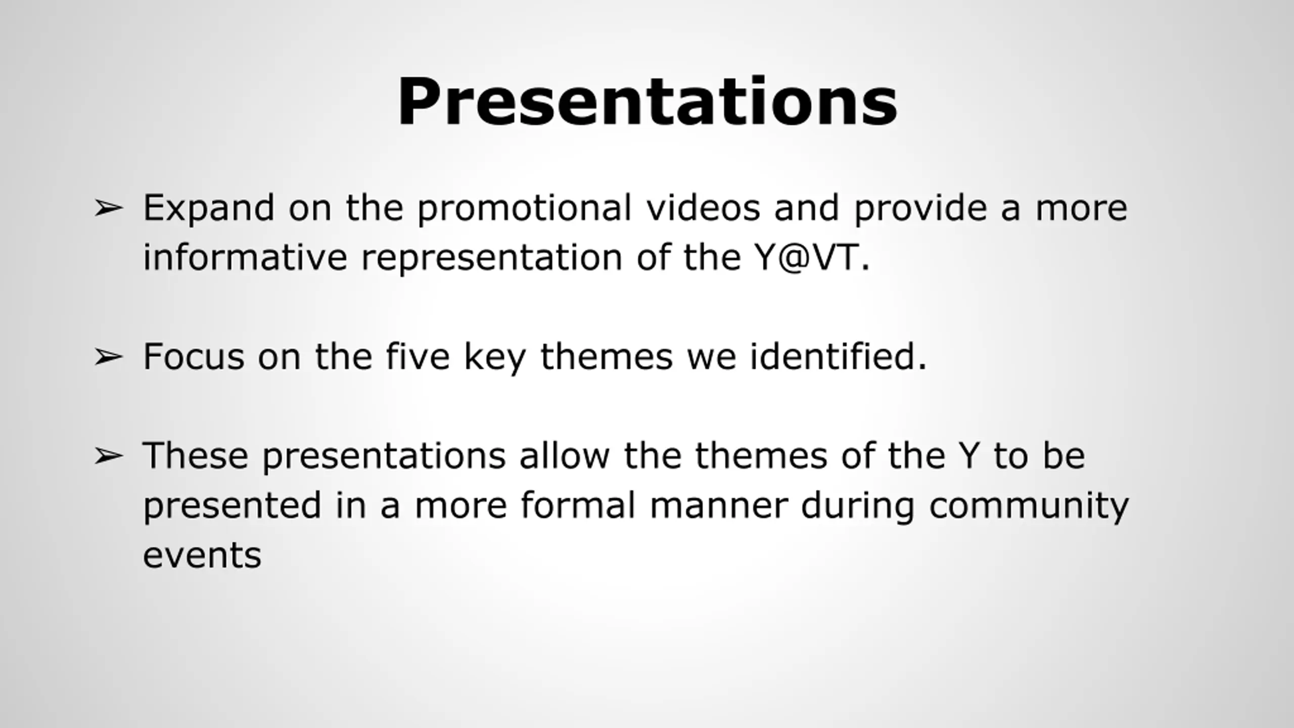Presentations Expand on the promotional videos and provide a more informative representation of the Y@VT. Focus on the five key themes we identified. These presentations allow the themes of the Y to be presented in a more formal manner during community events