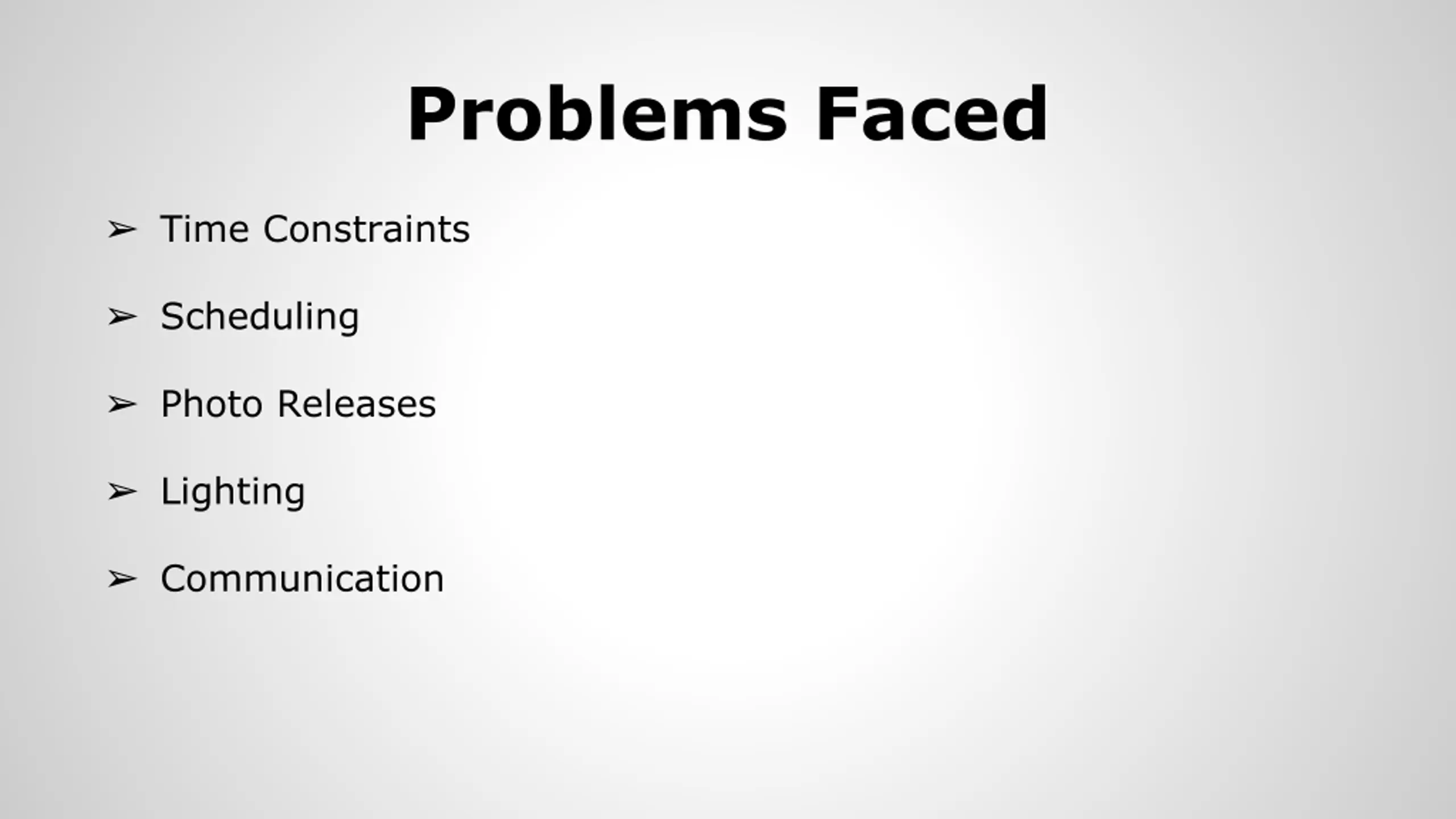 Problems Faced Time Constraints Scheduling Photo Releases Lighting Communication
