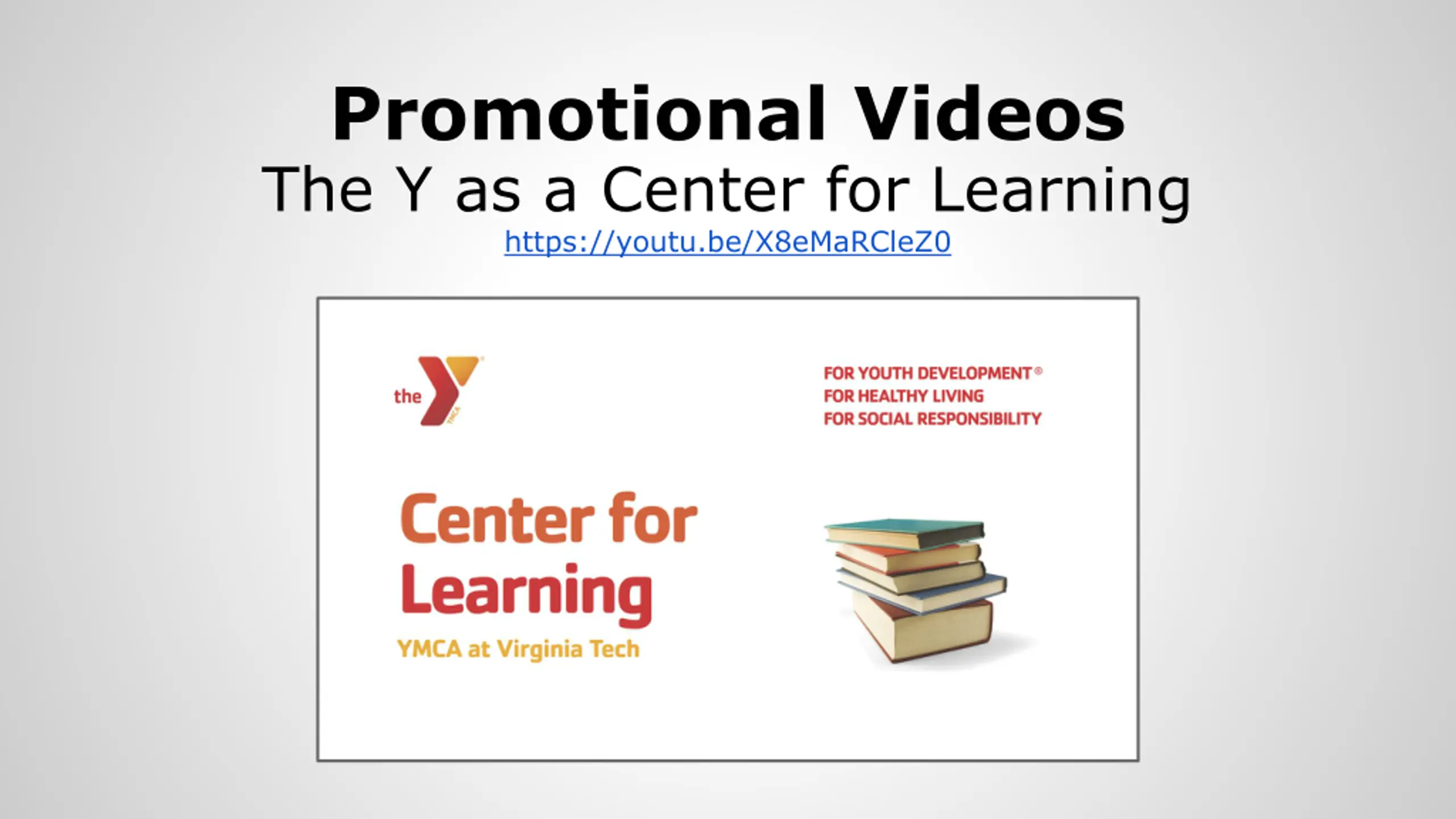 Promotional Videos The Y as a Center for Learning https://youtu.be/X8eMaRCleZ0