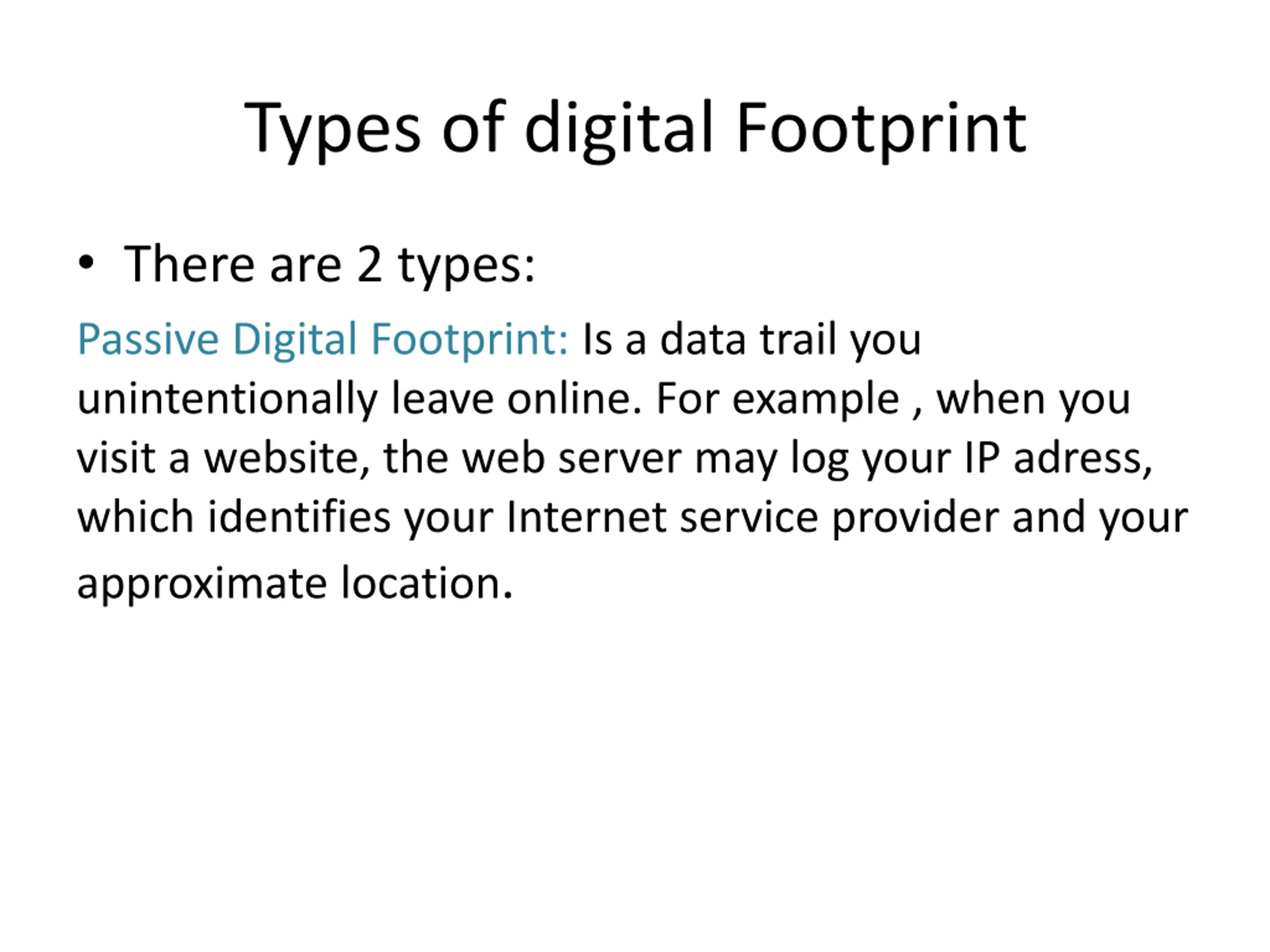 Types of digital Footprint There are 2 types: Passive Digital Footprint: Is a data trail you unintentionally leave online. For example , when you visit a website, the web server may log your IP adress, which identifies your Internet service provider and your approximate location.