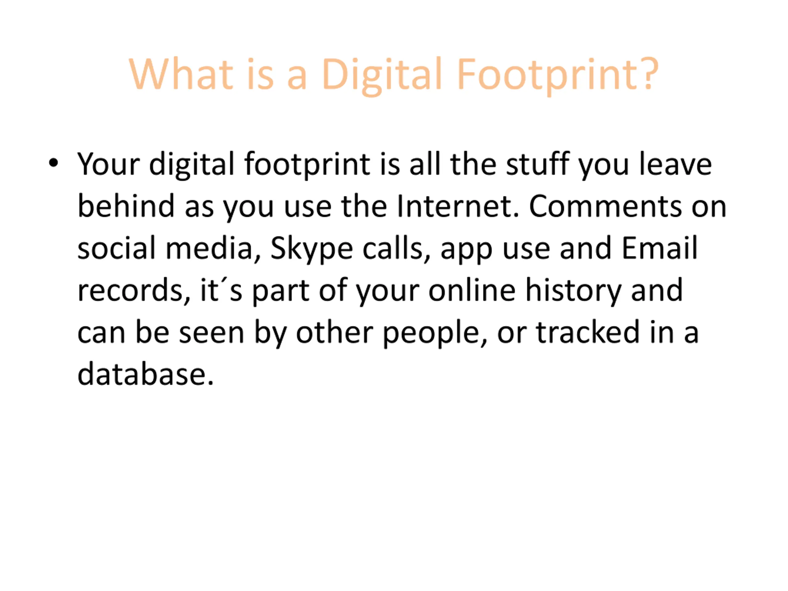 What is a Digital Footprint? Your digital footprint is all the stuff you leave behind as you use the Internet. Comments on social media, Skype calls, app use and Email records, it s part of your online history and can be seen by other people, or tracked in a database.