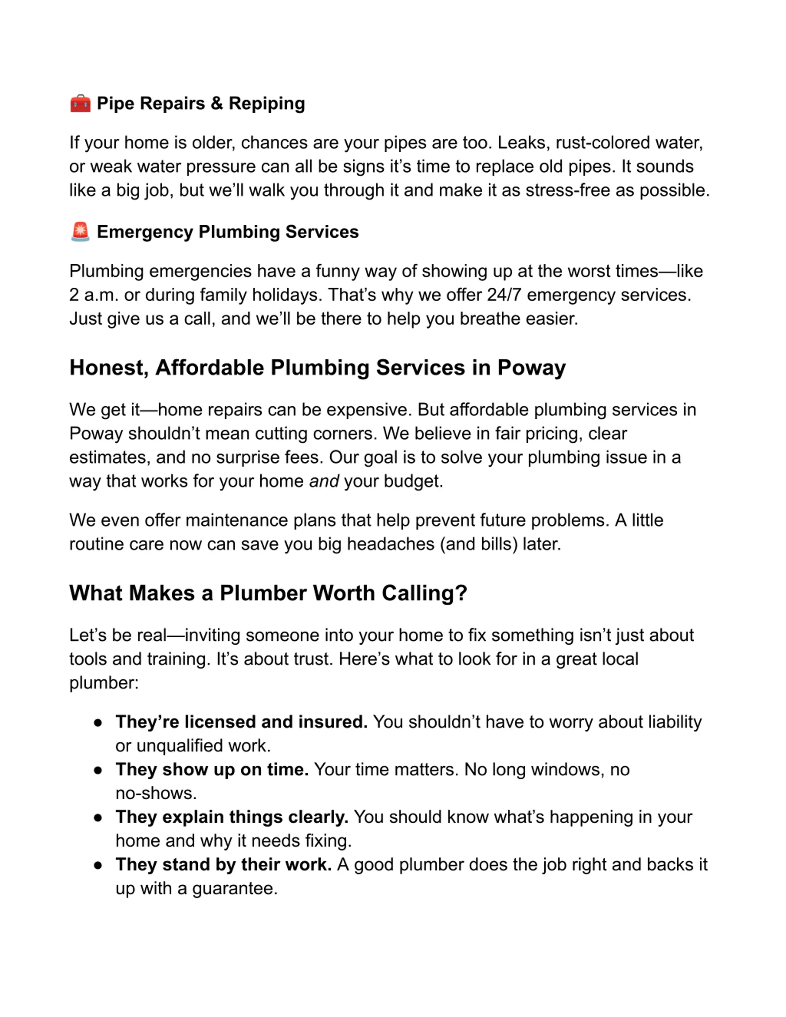 ? Pipe Repairs & Repiping If your home is older, chances are your pipes are too. Leaks, rust-colored water, or weak water pressure can all be signs it s time to replace old pipes. It sounds like a big job, but we ll walk you through it and make it as stress-free as possible. ? Emergency Plumbing Services Plumbing emergencies have a funny way of showing up at the worst times like 2 a.m. or during family holidays. That s why we offer 24/7 emergency services. Just give us a call, and we ll be there to help you breathe easier. Honest, Affordable Plumbing Services in Poway We get it home repairs can be expensive. But affordable plumbing services in Poway shouldn t mean cutting corners. We believe in fair pricing, clear estimates, and no surprise fees. Our goal is to solve your plumbing issue in a way that works for your home and your budget. We even offer maintenance plans that help prevent future problems. A little routine care now can save you big headaches (and bills) later. What Makes a Plumber Worth Calling? Let s be real inviting someone into your home to fix something isn t just about tools and training. It s about trust. Here s what to look for in a great local plumber: They re licensed and insured. You shouldn t have to worry about liability or unqualified work. They show up on time. Your time matters. No long windows, no no-shows. They explain things clearly. You should know what s happening in your home and why it needs fixing. They stand by their work. A good plumber does the job right and backs it up with a guarantee.