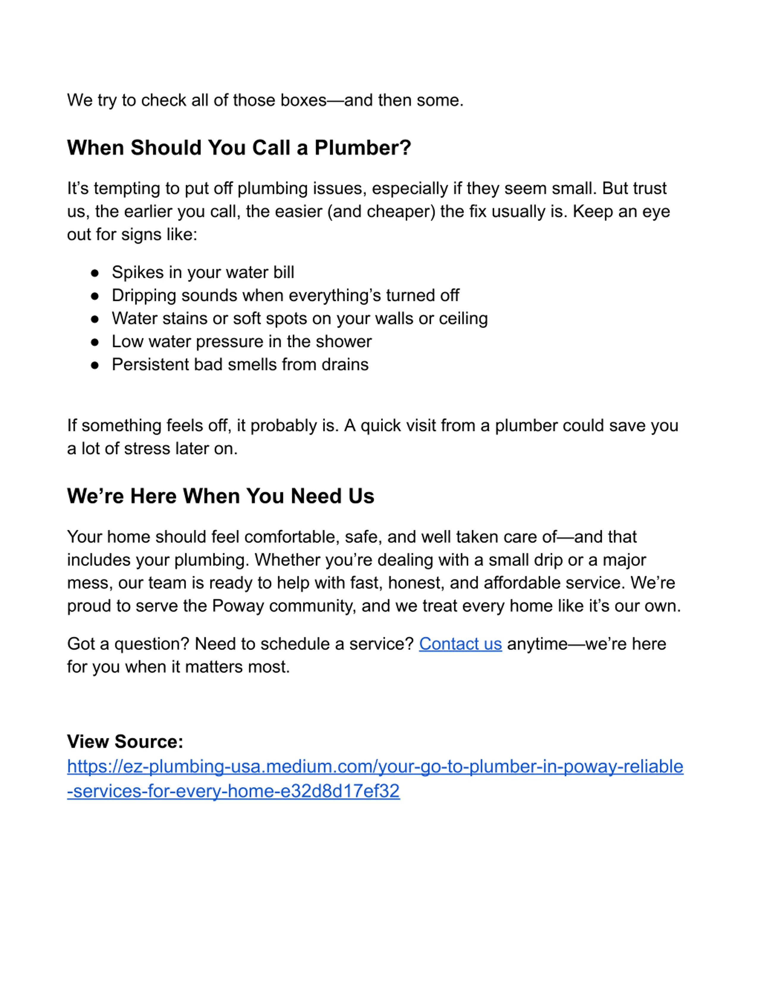 We try to check all of those boxesand then some. When Should You Call a Plumber? It s tempting to put off plumbing issues, especially if they seem small. But trust us, the earlier you call, the easier (and cheaper) the fix usually is. Keep an eye out for signs like: Spikes in your water bill Dripping sounds when everything s turned off Water stains or soft spots on your walls or ceiling Low water pressure in the shower Persistent bad smells from drains If something feels off, it probably is. A quick visit from a plumber could save you a lot of stress later on. We re Here When You Need Us Your home should feel comfortable, safe, and well taken care of and that includes your plumbing. Whether you re dealing with a small drip or a major mess, our team is ready to help with fast, honest, and affordable service. We re proud to serve the Poway community, and we treat every home like it s our own. Got a question? Need to schedule a service? Contact us anytime we re here for you when it matters most. View Source: https://ez-plumbing-usa.medium.com/your-go-to-plumber-in-poway-reliable -services-for-every-home-e32d8d17ef32