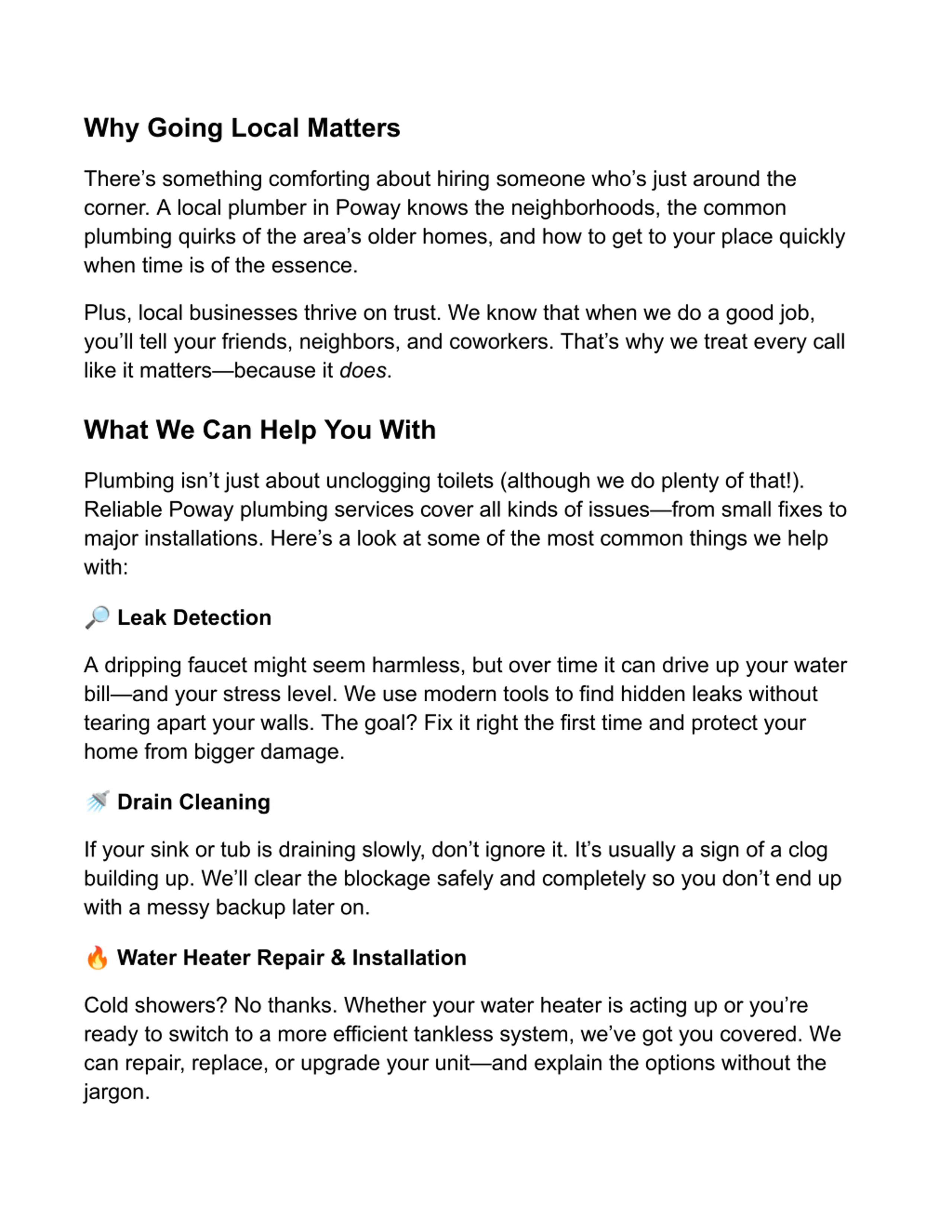 Why Going Local Matters There s something comforting about hiring someone who s just around the corner. A local plumber in Poway knows the neighborhoods, the common plumbing quirks of the area s older homes, and how to get to your place quickly when time is of the essence. Plus, local businesses thrive on trust. We know that when we do a good job, you ll tell your friends, neighbors, and coworkers. That s why we treat every call like it matters because it does. What We Can Help You With Plumbing isn t just about unclogging toilets (although we do plenty of that!). Reliable Poway plumbingservices cover all kinds of issues from small fixes to major installations. Here s a look at some of the most common things we help with: ? Leak Detection A dripping faucet might seem harmless, but over time it can drive up your water bill and your stress level. We use modern tools to find hidden leaks without tearing apart your walls. The goal? Fix it right the first time and protect your home from bigger damage. ? Drain Cleaning If your sink or tub is draining slowly, don t ignore it. It s usually a sign of a clog building up. We ll clear the blockage safely and completely so you don t end up with a messy backup later on. ? Water Heater Repair & Installation Cold showers? No thanks. Whether your water heater is acting up or you re ready to switch to a more efficient tankless system, we ve got you covered. We can repair, replace, or upgrade your unit and explain the options without the jargon.