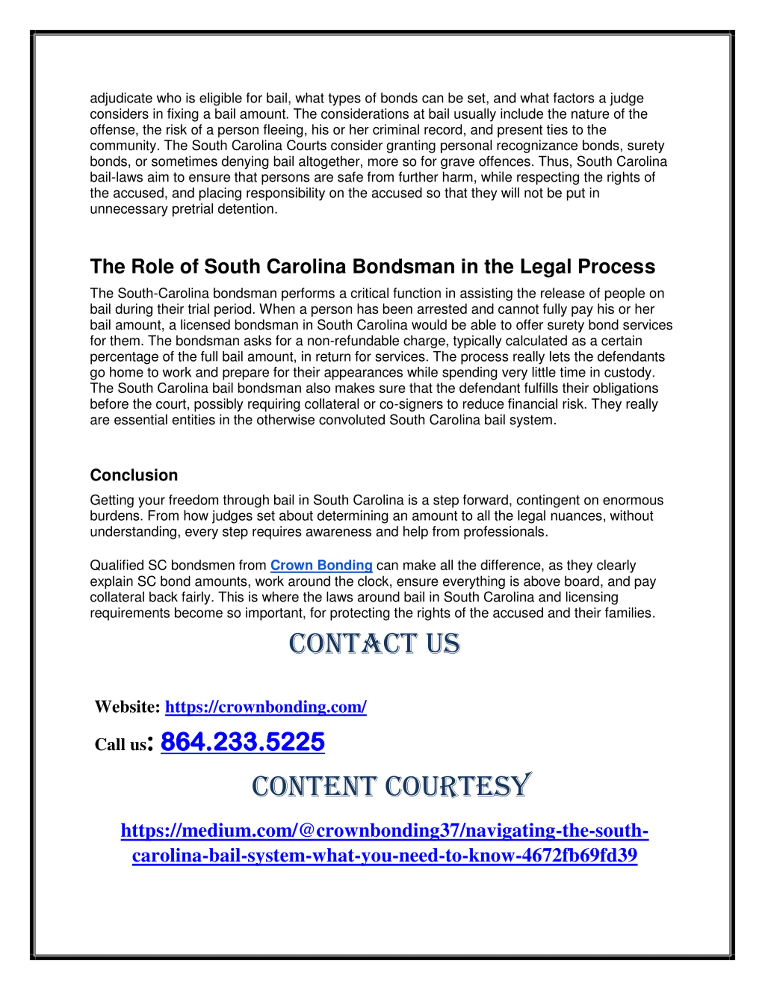 adjudicate who is eligible for bail, what types of bonds can be set, and what factors a judge considers in fixing a bail amount. The considerations at bail usually include the nature of the offense, the risk of a person fleeing, his or her criminal record, and present ties to the community. The South Carolina Courts consider granting personal recognizance bonds, surety bonds, or sometimes denying bail altogether, more so for grave offences. Thus, South Carolina bail-laws aim to ensure that persons are safe from further harm, while respecting the rights of the accused, and placing responsibility on the accused so that they will not be put in unnecessary pretrial detention. The Role of South Carolina Bondsman in the Legal Process The South-Carolina bondsman performs a critical function in assisting the release of people on bail during their trial period. When a person has been arrested and cannot fully pay his or her bail amount, a licensed bondsman in South Carolina would be able to offer surety bond services for them. The bondsman asks for a non-refundable charge, typically calculated as a certain percentage of the full bail amount, in return for services. The process really lets the defendants go home to work and prepare for their appearances while spending very little time in custody. The South Carolina bail bondsman also makes sure that the defendant fulfills their obligations before the court, possibly requiring collateral or co-signers to reduce financial risk. They really are essential entities in the otherwise convoluted South Carolina bail system. Conclusion Getting your freedom through bail in South Carolina is a step forward, contingent on enormous burdens. From how judges set about determining an amount to all the legal nuances, without understanding, every step requires awareness and help from professionals. Qualified SC bondsmen from Crown Bonding can make all the difference, as they clearly explain SC bond amounts, work around the clock, ensure everything is above board, and pay collateral back fairly. This is where the laws around bail in South Carolina and licensing requirements become so important, for protecting the rights of the accused and their families. Contact us Website: https://crownbonding.com/ 864.233.5225 Content Courtesy Call us: : 864.233.5225 https://medium.com/@crownbonding37/navigating-the-south- carolina-bail-system-what-you-need-to-know-4672fb69fd39