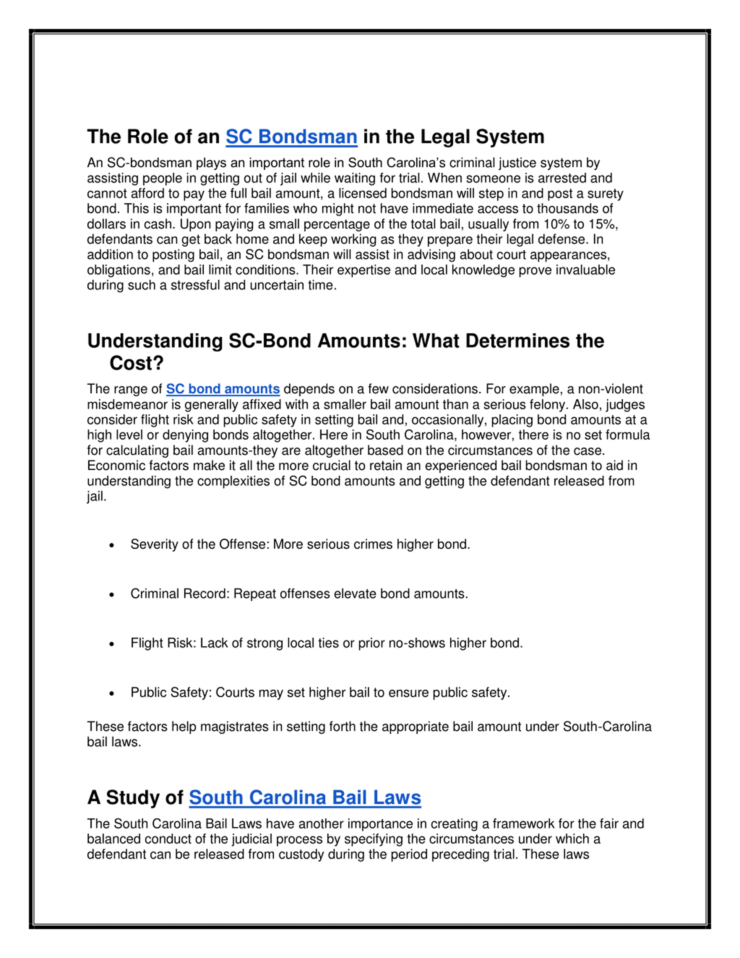 The Role of an SC Bondsman in the Legal System An SC-bondsman plays an important role in South Carolina s criminal justice system by assisting people in getting out of jail while waiting for trial. When someone is arrested and cannot afford to pay the full bail amount, a licensed bondsman will step in and post a surety bond. This is important for families who might not have immediate access to thousands of dollars in cash. Upon paying a small percentage of the total bail, usually from 10% to 15%, defendants can get back home and keep working as they prepare their legal defense. In addition to posting bail, an SC bondsman will assist in advising about court appearances, obligations, and bail limit conditions. Their expertise and local knowledge prove invaluable during such a stressful and uncertain time. Understanding SC-Bond Amounts: What Determines the Cost? The range of SC bond amounts depends on a few considerations. For example, a non-violent misdemeanor is generally affixed with a smaller bail amount than a serious felony. Also, judges consider flight risk and public safety in setting bail and, occasionally, placing bond amounts at a high level or denying bonds altogether. Here in South Carolina, however, there is no set formula for calculating bail amounts-they are altogether based on the circumstances of the case. Economic factors make it all the more crucial to retain an experienced bail bondsman to aid in understanding the complexities of SC bond amounts and getting the defendant released from jail. Severity of the Offense: More serious crimes higher bond. Criminal Record: Repeat offenses elevate bond amounts. Flight Risk: Lack of strong local ties or prior no-shows higher bond. Public Safety: Courts may set higher bail to ensure public safety. These factors help magistrates in setting forth the appropriate bail amount under South-Carolina bail laws. A Study of South Carolina Bail Laws The South Carolina Bail Laws have another importance in creating a framework for the fair and balanced conduct of the judicial process by specifying the circumstances under which a defendant can be released from custody during the period preceding trial. These laws