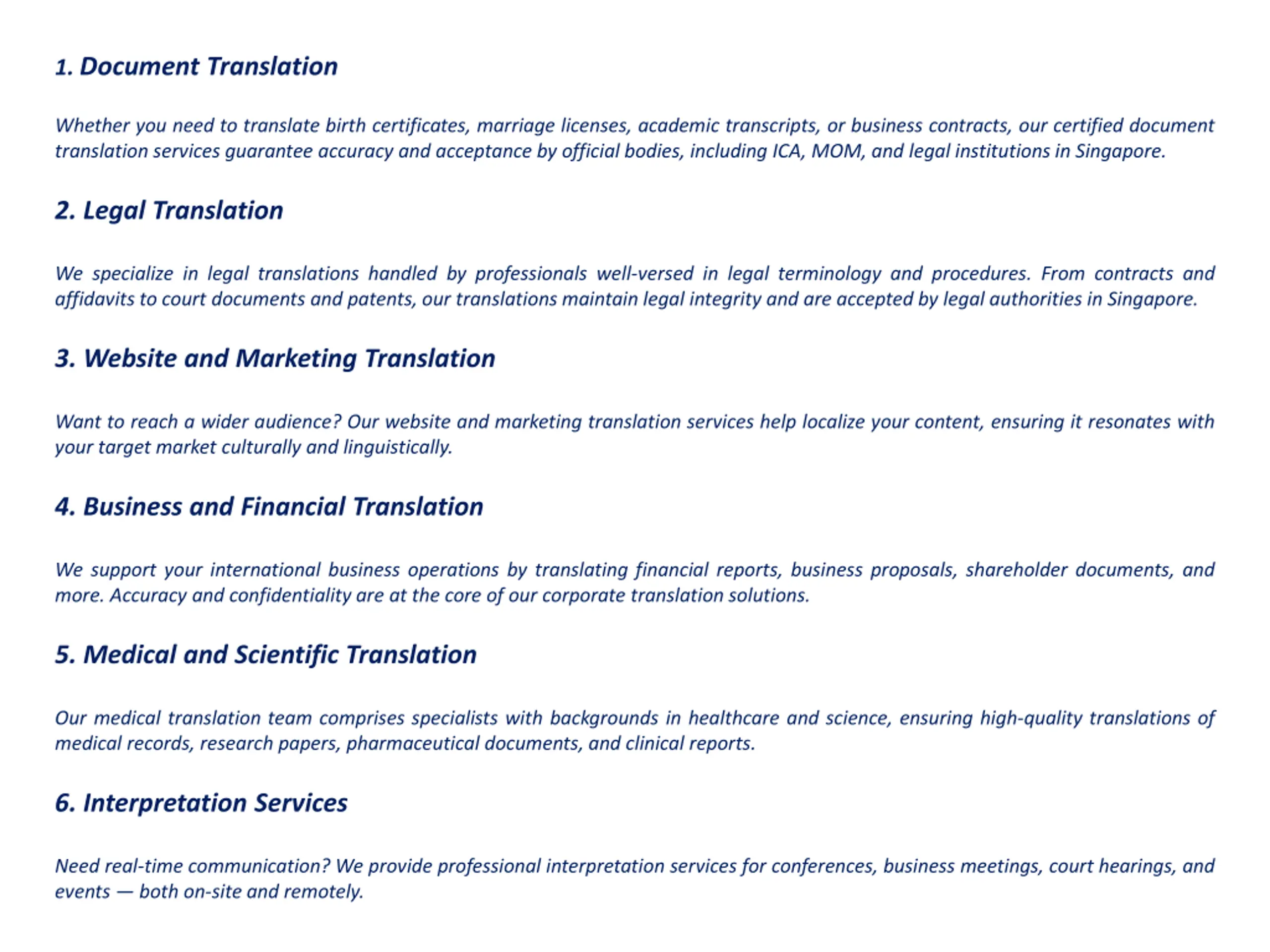 1. Document Translation Whether you need to translate birth certificates, marriage licenses, academic transcripts, or business contracts, our certified document translation services guarantee accuracy and acceptance by official bodies, including ICA, MOM, and legal institutions in Singapore. 2. Legal Translation We specialize in legal translations handled by professionals well-versed in legal terminology and procedures. From contracts and affidavits to court documents and patents, our translations maintain legal integrity and are accepted by legal authorities in Singapore. 3. Website and Marketing Translation Want to reach a wider audience? Our website and marketing translation services help localize your content, ensuring it resonates with your target market culturally and linguistically. 4. Business and Financial Translation We support your international business operations by translating financial reports, business proposals, shareholder documents, and more. Accuracy and confidentiality are at the core of our corporate translation solutions. 5. Medical and Scientific Translation Our medical translation team comprises specialists with backgrounds in healthcare and science, ensuring high-quality translations of medical records, research papers, pharmaceutical documents, and clinical reports. 6. Interpretation Services Need real-time communication? We provide professional interpretation services for conferences, business meetings, court hearings, and events both on-site and remotely.