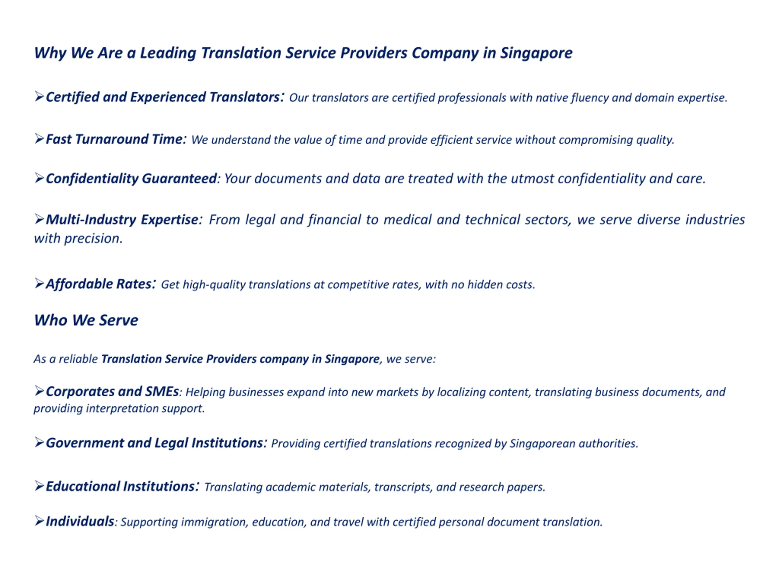Why We Are a Leading Translation Service Providers Company in Singapore Certified and Experienced Translators: Our translators are certified professionals with native fluency and domain expertise. Fast Turnaround Time: We understand the value of time and provide efficient service without compromising quality. Confidentiality Guaranteed: Your documents and data are treated with the utmost confidentiality and care. Multi-Industry Expertise: From legal and financial to medical and technical sectors, we serve diverse industries with precision. Affordable Rates: Get high-quality translations at competitive rates, with no hidden costs. Who We Serve As a reliable Translation Service Providers company in Singapore, we serve: Corporates and SMEs: Helping businesses expand into new markets by localizing content, translating business documents, and providing interpretation support. Government and Legal Institutions: Providing certified translations recognized by Singaporean authorities. Educational Institutions: Translating academic materials, transcripts, and research papers. Individuals: Supporting immigration, education, and travel with certified personal document translation.