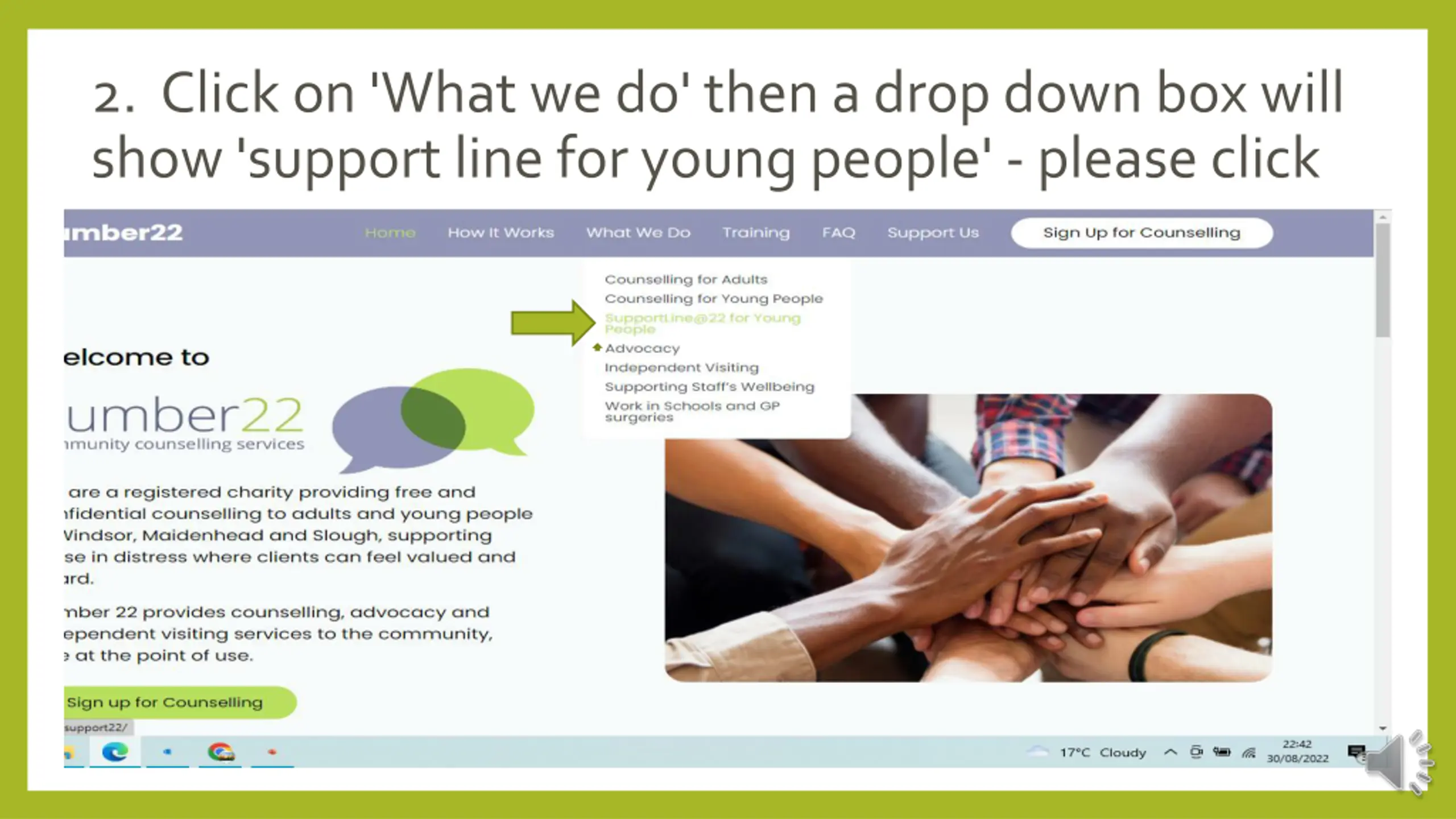 2. Click on 'What we do' then a drop down box will show 'support line for young people' - please click