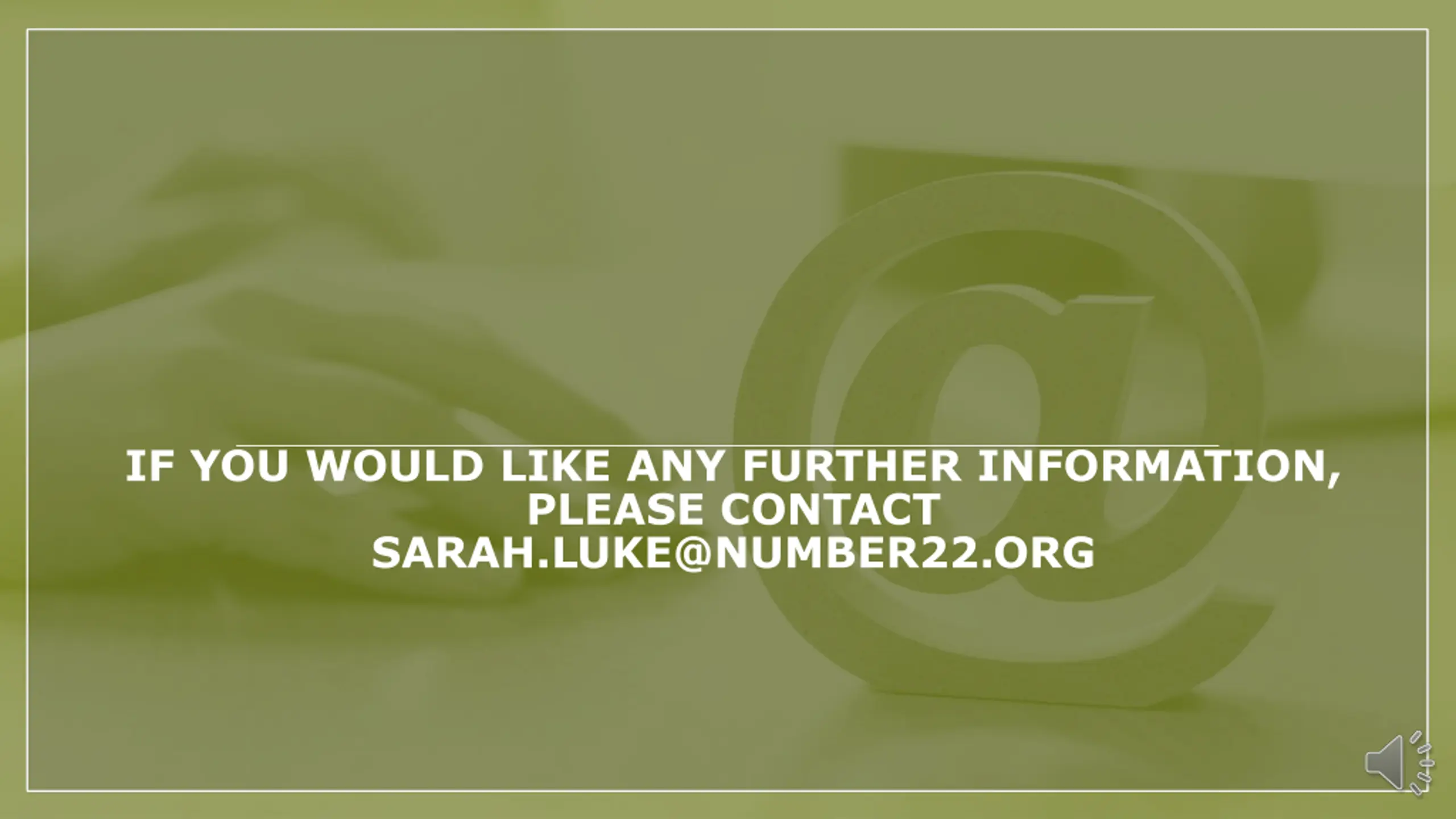 IF YOU WOULD LIKE ANY FURTHER INFORMATION, PLEASE CONTACT SARAH.LUKE@NUMBER22.ORG