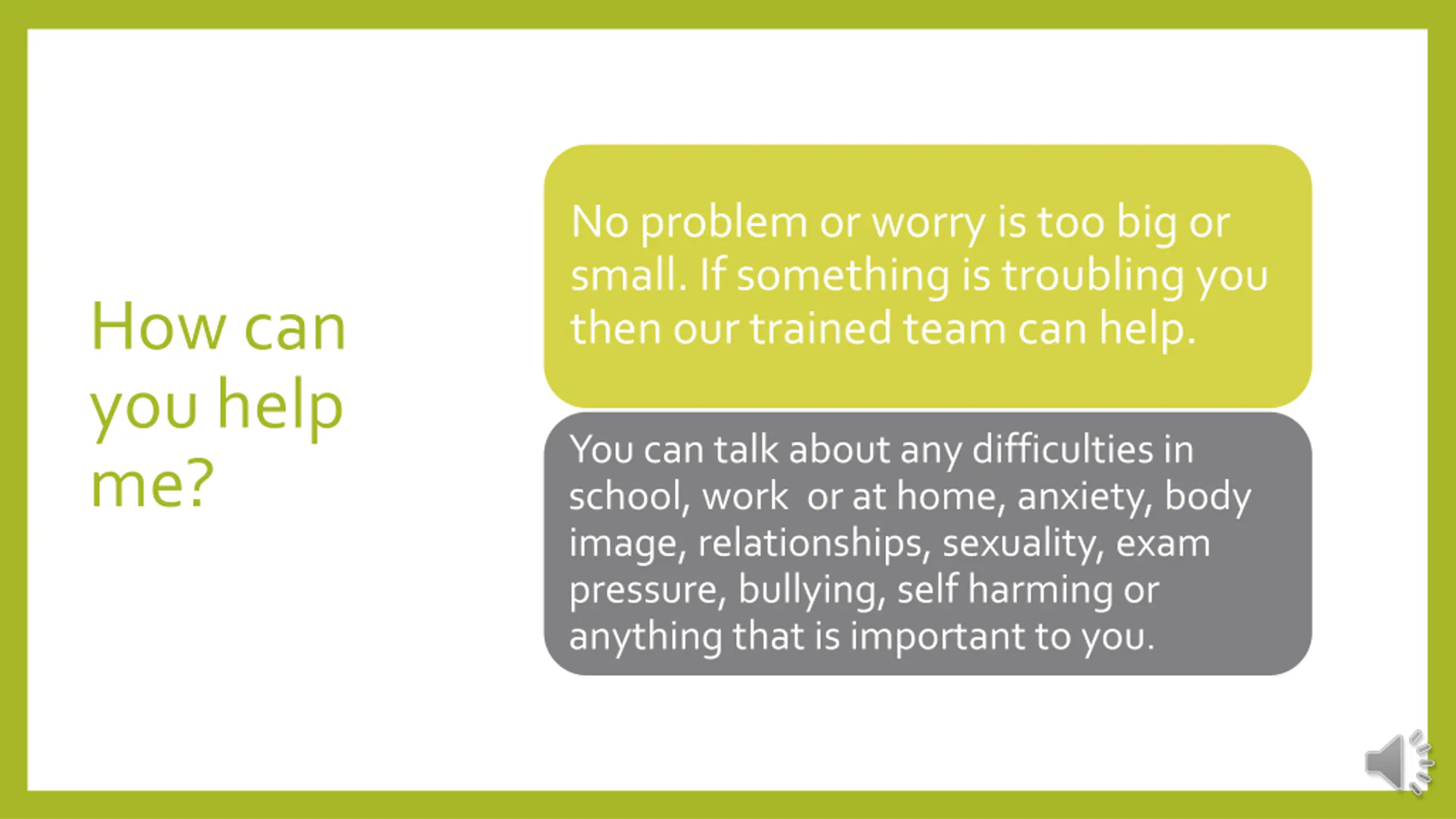 No problem or worry is too big or small. If something istroublingyou then our trained team can help. How can you help me? You can talk about any difficulties in school, work or at home, anxiety, body image, relationships, sexuality, exam pressure, bullying, self harming or anything that is important to you.
