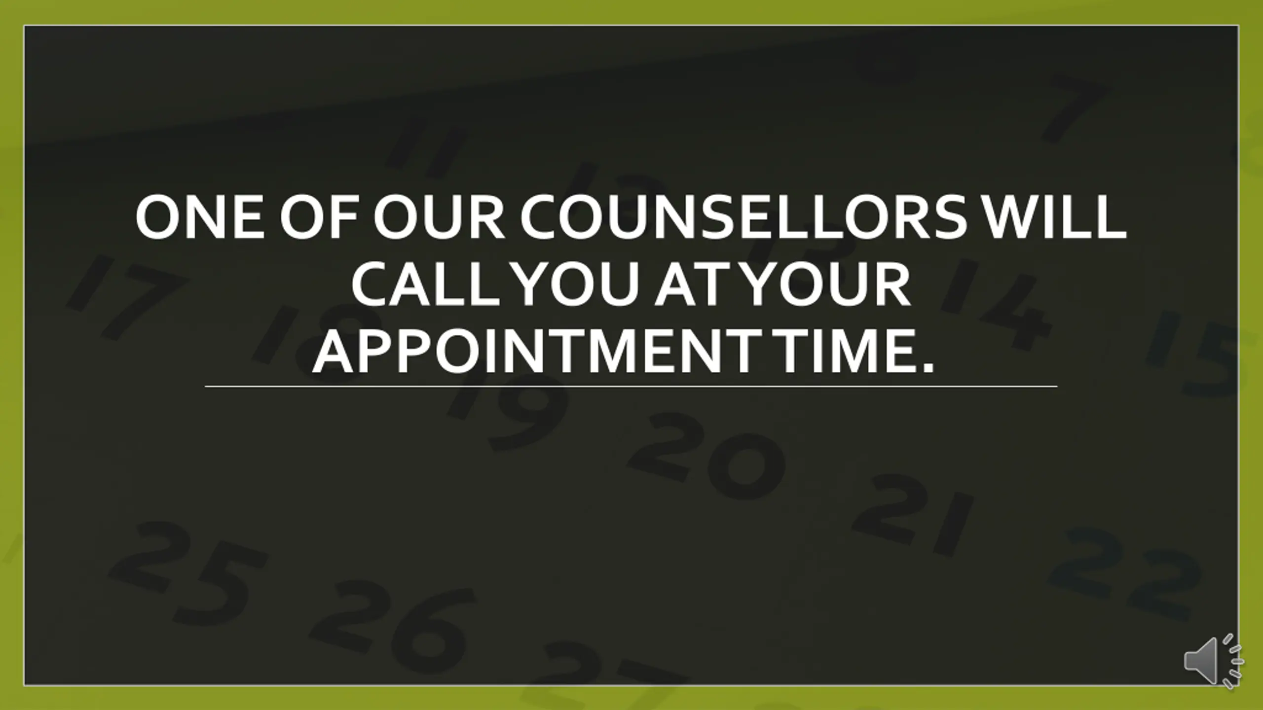 ONE OF OURCOUNSELLORS WILL CALL YOU AT YOUR APPOINTMENT TIME.