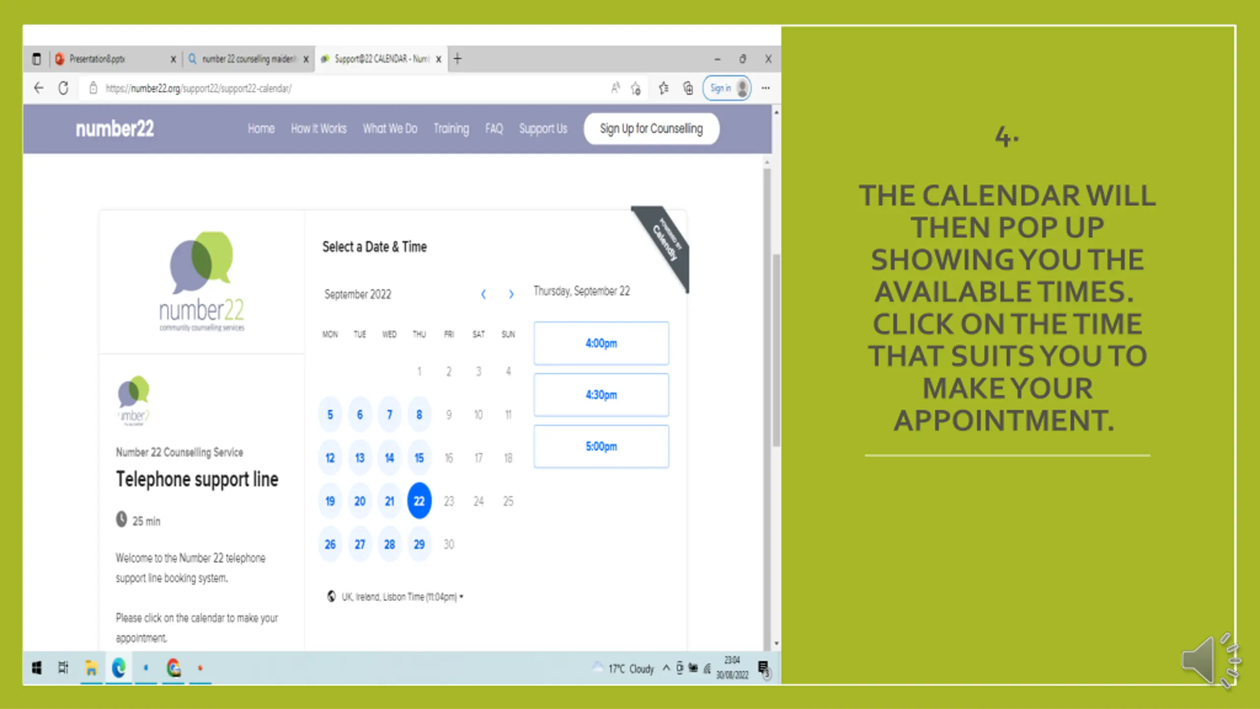 4. THE CALENDAR WILL THEN POP UP SHOWING YOU THE AVAILABLE TIMES. CLICK ON THE TIME THAT SUITS YOU TO MAKE YOUR APPOINTMENT.