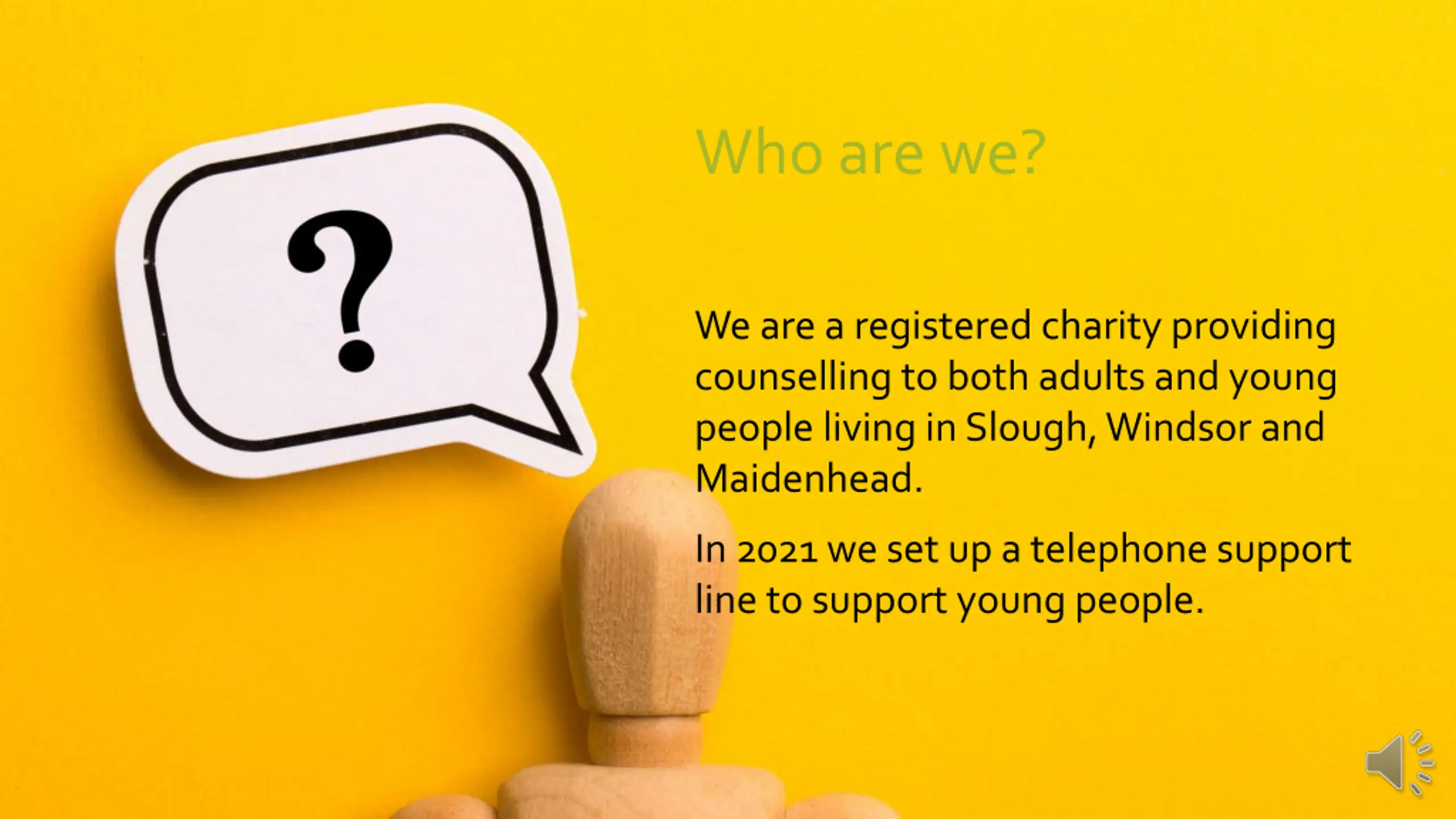 Who are we? We are a registered charity providing counselling to both adults and young people living in Slough, Windsor and Maidenhead. In 2021 we set up a telephone support line to support young people.