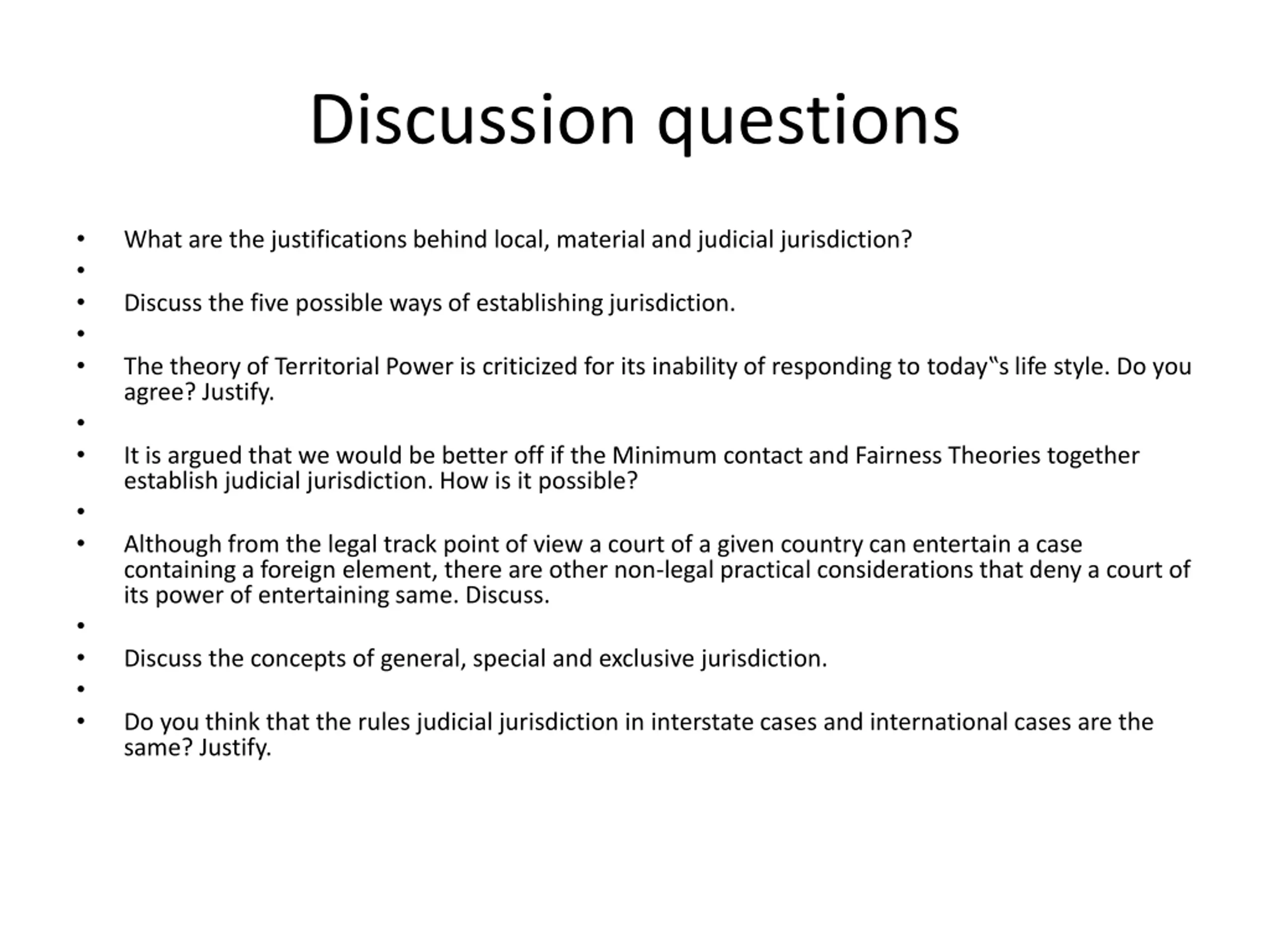 Discussion questions What are the justifications behind local, material and judicial jurisdiction? Discuss the five possible ways of establishing jurisdiction. The theory of Territorial Power is criticized for its inability of responding to today s life style. Do you agree? Justify. It is argued that we would be better off if the Minimum contact and Fairness Theories together establish judicial jurisdiction. How is it possible? Although from the legal track point of view a court of a given country can entertain a case containing a foreign element, there are other non-legal practical considerations that deny a court of its power of entertaining same. Discuss. Discuss the concepts of general, special and exclusive jurisdiction. Do you think that the rules judicial jurisdiction in interstate cases and international cases are the same? Justify.