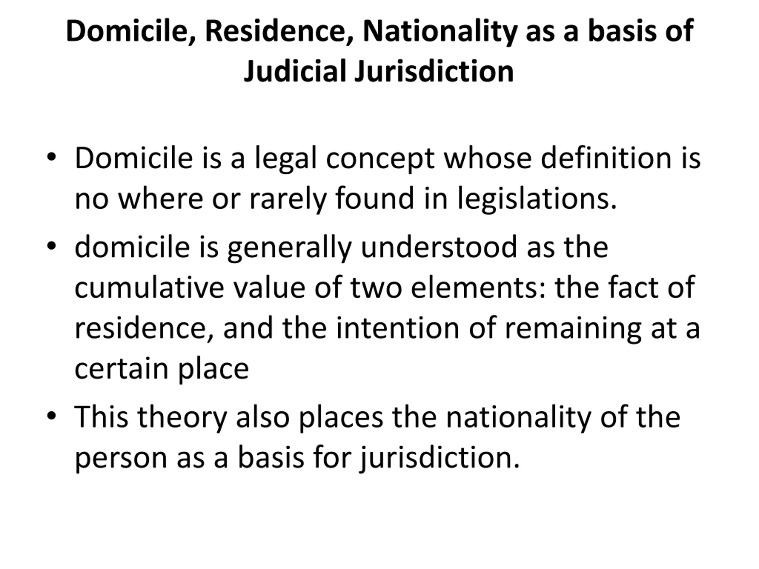 Domicile, Residence, Nationality as a basis of Judicial Jurisdiction Domicile is a legal concept whose definition is no where or rarely found in legislations. domicile is generally understood as the cumulative value of two elements: the fact of residence, and the intention of remaining at a certain place This theory also places the nationality of the person as a basis for jurisdiction.
