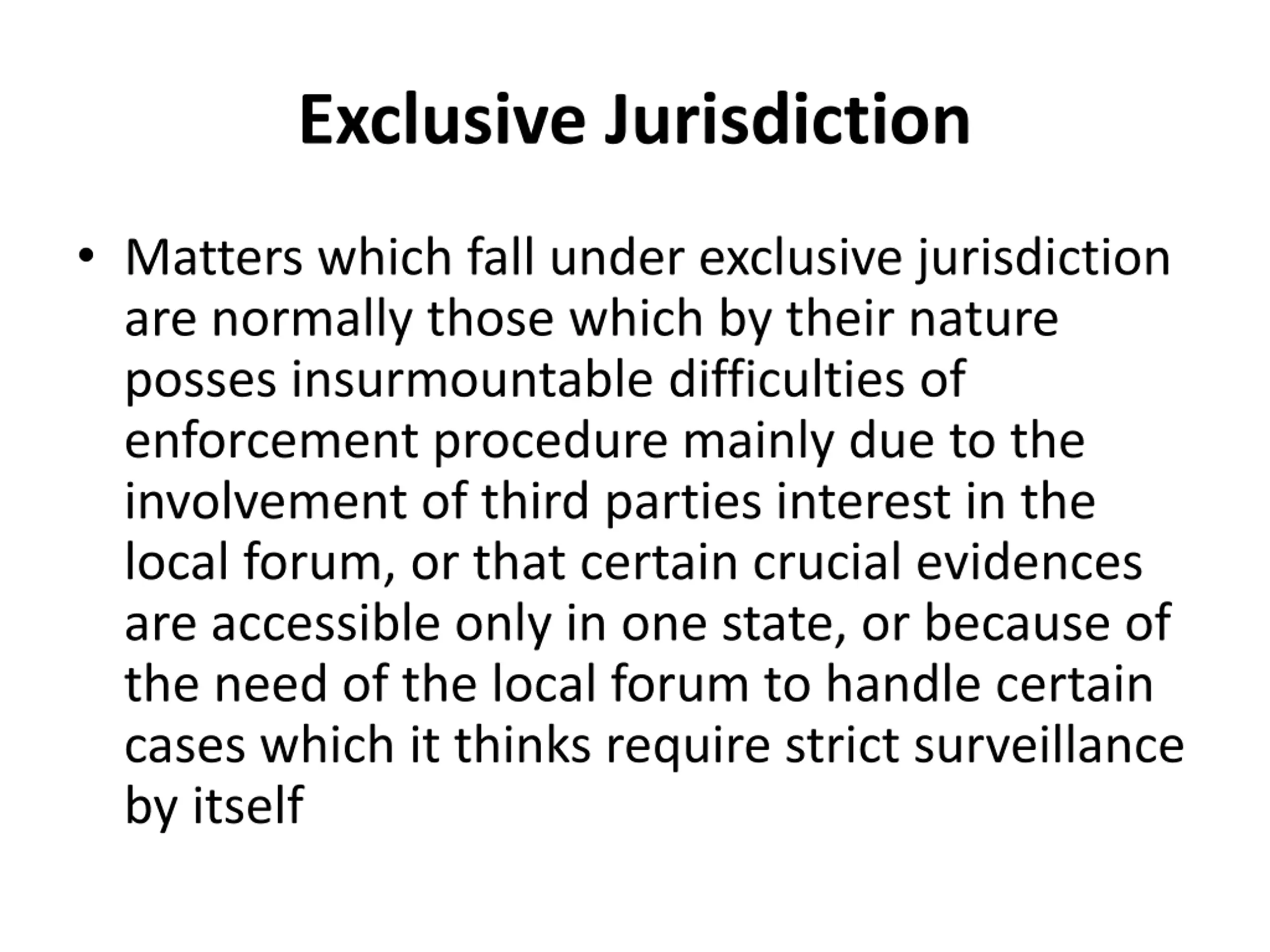 Exclusive Jurisdiction Matters which fall under exclusive jurisdiction are normally those which by their nature posses insurmountable difficulties of enforcement procedure mainly due to the involvement of third parties interest in the local forum, or that certain crucial evidences are accessible only in one state, or because of the need of the local forum to handle certain cases which it thinks require strict surveillance by itself
