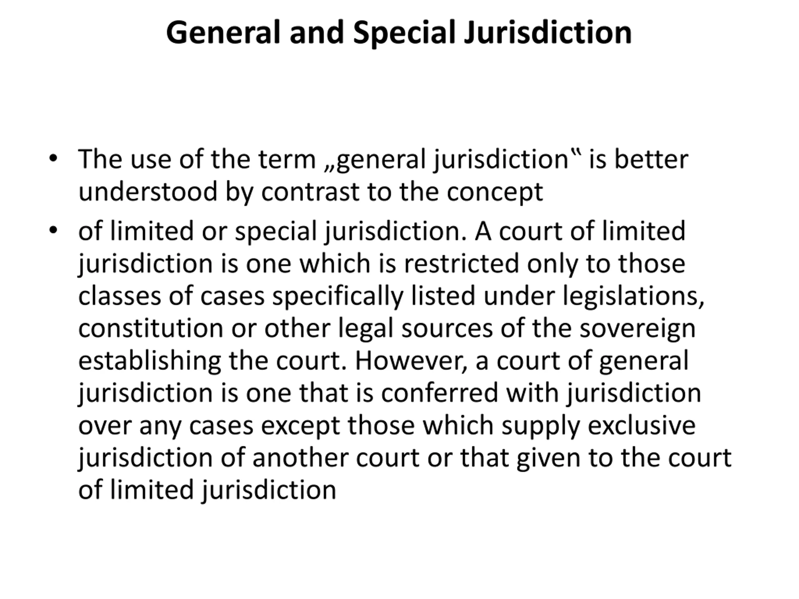 General and Special Jurisdiction The use of the term general jurisdiction is better understood by contrast to the concept of limited or special jurisdiction. A court of limited jurisdiction is one which is restricted only to those classes of cases specifically listed under legislations, constitution or other legal sources of the sovereign establishing the court. However, a court of general jurisdiction is one that is conferred with jurisdiction over any cases except those which supply exclusive jurisdiction of another court or that given to the court of limited jurisdiction