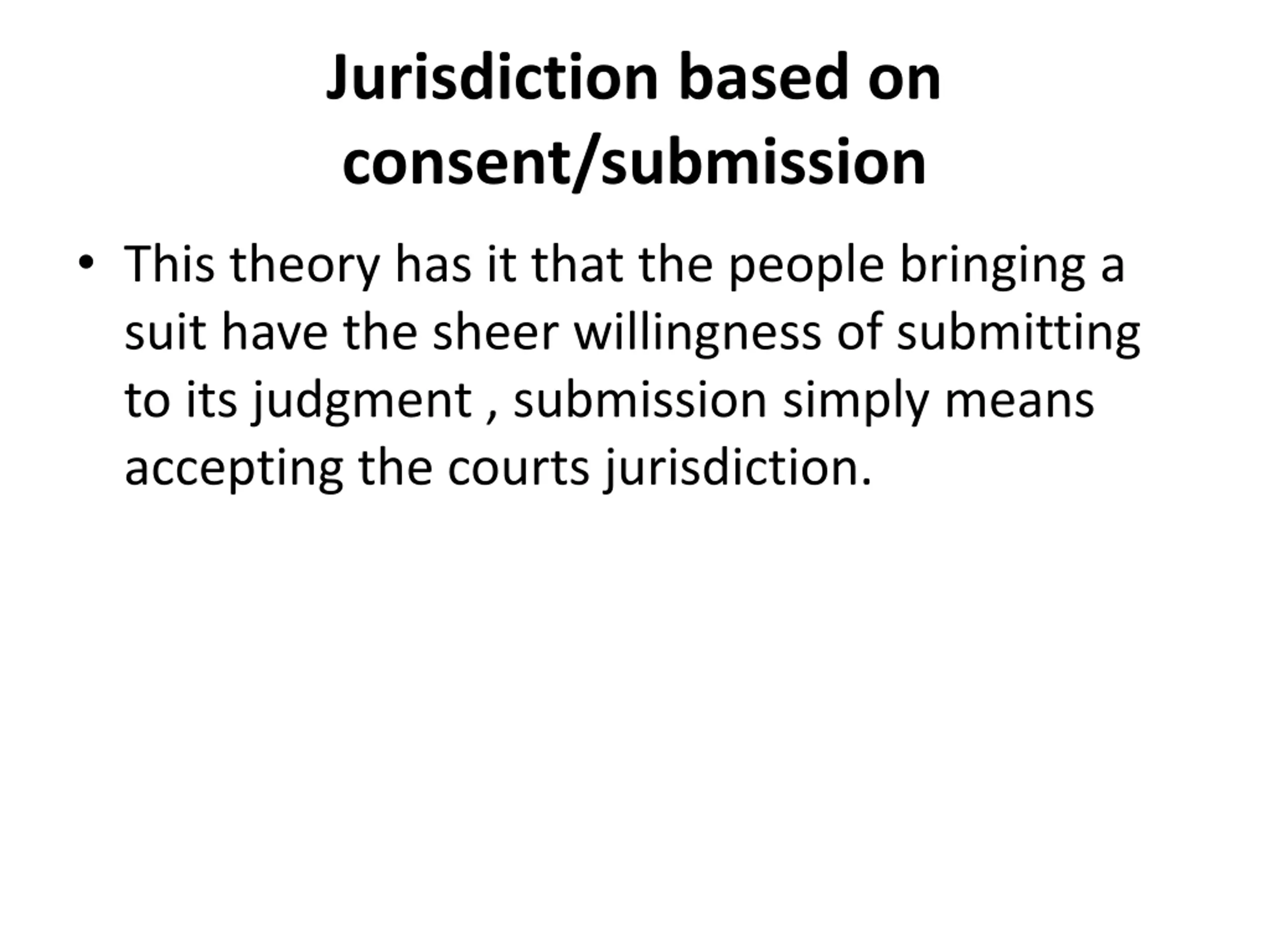 Jurisdiction based on consent/submission This theory has it that the people bringing a suit have the sheer willingness of submitting to its judgment , submission simply means accepting the courts jurisdiction.